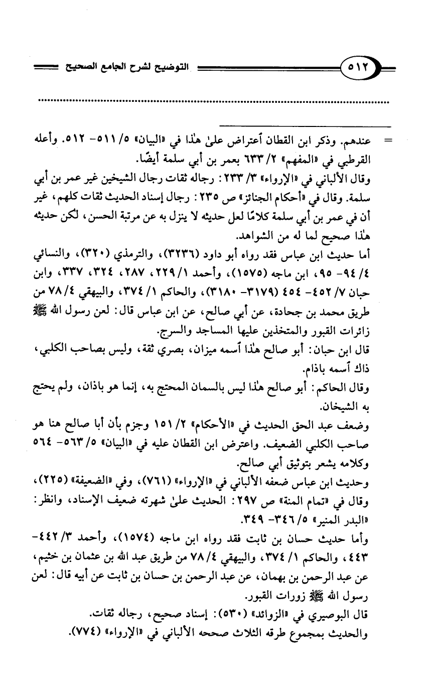 أما حديث ابن عباس فقد رواه أبو داود (3236)، والترمذي (320)، والنسائي 4/ 94 - 95، ابن ماجه (1575)، وأحمد 1/ 229، 287، 324، 337، وابن حبان 7/ 452 - 454 (3179 - 3180)، والحاكم 1/ 374، والبيهقي 4/ 78 من طريق محمد بن جحادة، عن أبي صالح، عن ابن عباس قال: لعن رسول الله - صلى الله عليه وسلم - زائرات القبور والمتخذين عليها المساجد والسرج.