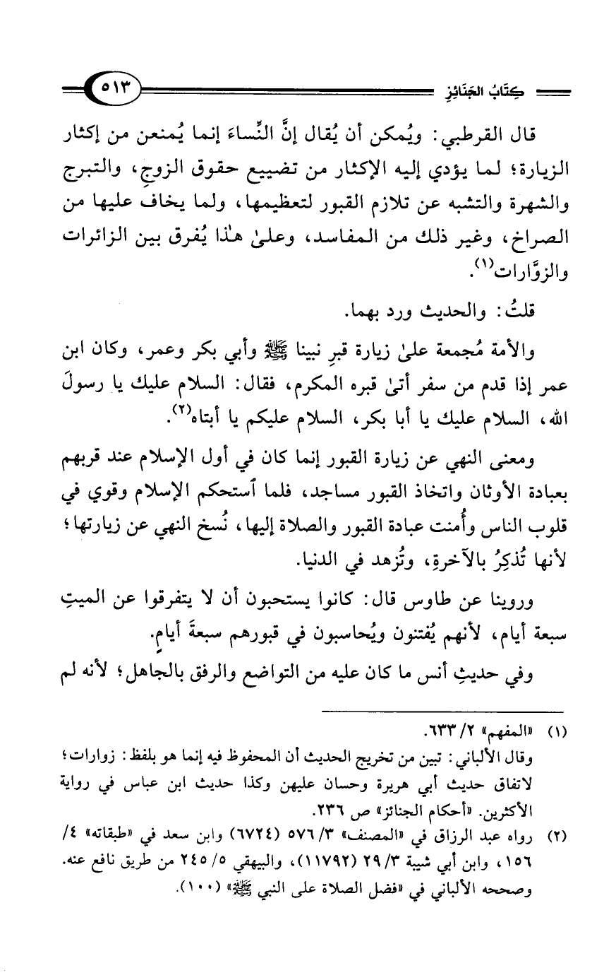 وقال الألباني: تبين من تخريج الحديث أن المحفوظ فيه إنما هو بلفظ: زوارات؛ لاتفاق حديث أبي هريرة وحسان عليهن وكذا حديث ابن عباس في رواية الأكثرين. "أحكام الجنائز" ص 236.