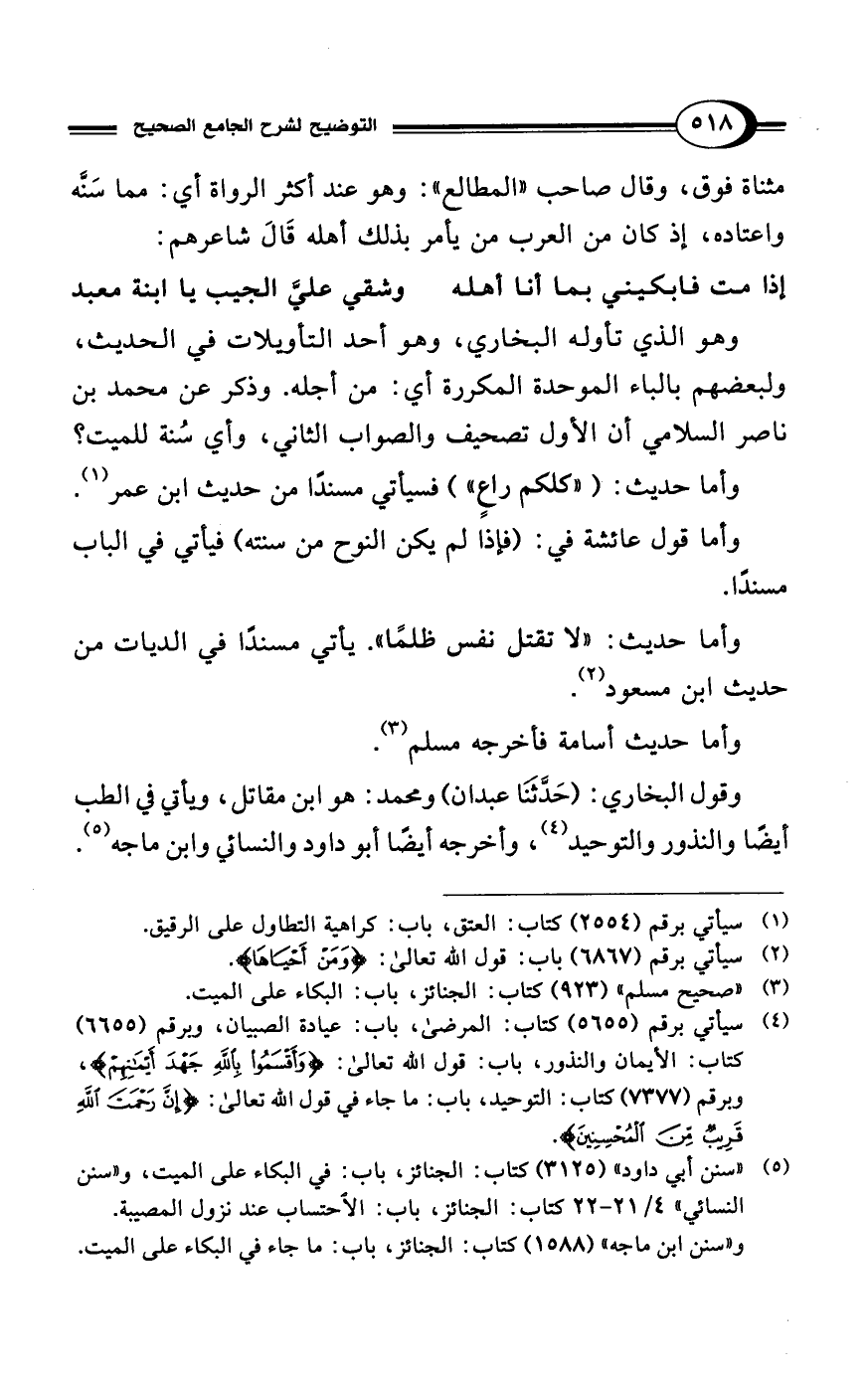 (¬5) "سنن أبي داود" (3125) كتاب: الجنائز، باب: في البكاء على الميت، و"سنن النسائي" 4/ 21 - 22 كتاب: الجنائز، باب: الاحتساب عند نزول المصيبة.