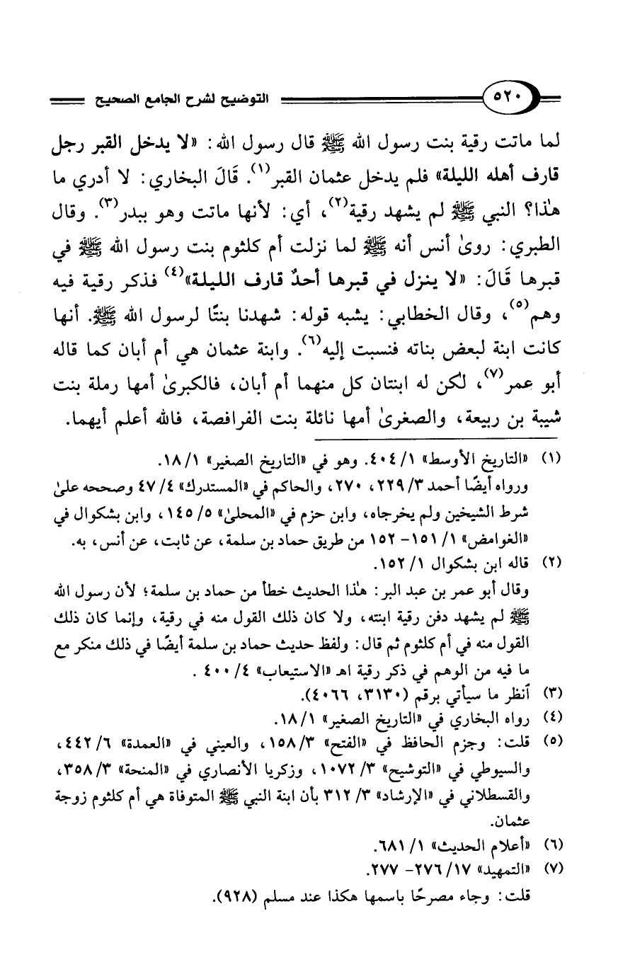 (¬5) قلت: وجزم الحافظ في "الفتح" 3/ 158، والعيني في "العمدة" 6/ 442، والسيوطي في "التوشيح" 3/ 1072، وزكريا الأنصاري في "المنحة" 3/ 358، والقسطلاني في "الإرشاد" 3/ 312 بأن ابنة النبي - صلى الله عليه وسلم - المتوفاة هي أم كلثوم زوجة عثمان.