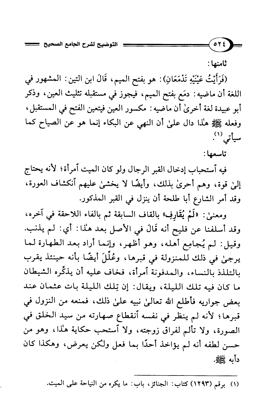 (فَرَأَيْتُ عَيْنَيْهِ تَدْمَعَانِ): هو بفتح الميم، قَالَ ابن التين: المشهور في اللغة أن ماضيه: دمَع بفتح الميم، فيجوز في مستقبله تثليث العين، وذكر أبو عبيدة لغة أخرى أن ماضيه: مكسور العين فيتعين الفتح في المستقبل، وفعله - صلى الله عليه وسلم - هذا دال على أن النهي عن البكاء إنما هو عن الصياح كما سيأتي (¬1).