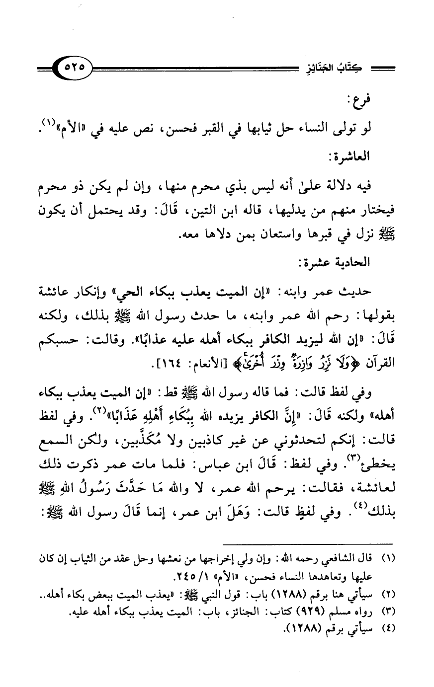 حديث عمر وابنه: "إن الميت يعذب ببكاء الحي" وإنكار عائشة بقولها: رحم الله عمر وابنه، ما حدث رسول الله - صلى الله عليه وسلم - بذلك، ولكنه قَالَ: "إن الله ليزيد الكافر ببكاء أهله عليه عذابًا". وقالت: حسبكم القرآن {وَلَا تَزِرُ وَازِرَةٌ وِزْرَ أُخْرَى} [الأنعام: 164].