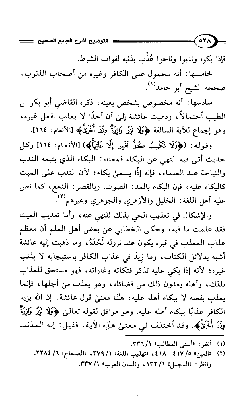 وقوله: ({وَلَا تَكْسِبُ كُلُّ نَفْسٍ إِلَّا عَلَيْهَا}) [الأنعام: 164] وكل حديث أتى فيه النهي عن البكاء فمعناه: البكاء الذي يتبعه الندب والنياحة عند العلماء، فإنه إذًا يسمى بكاء؛ لأن الندب على الميت كالبكاء عليه، فإن البكاء بالمد: الصوت. وبالقصر: الدمع، كما نص عليه أهل اللغة: الخليل والأزهري والجوهري وغيرهم (¬2).