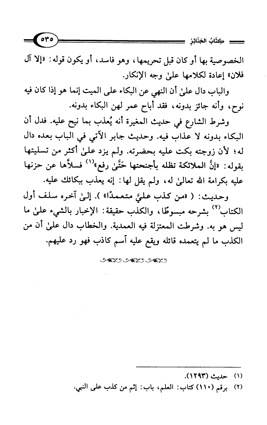 وشرط الشارع في حديث المغيرة أنه يُعذب بما نيح عليه. فدل أن البكاء بدونه لا عذاب فيه. وحديث جابر الآتي في الباب بعده دال له؛ لأن زوجته بكت عليه بحضرته. ولم يزد على أكثر من تسليتها بقوله: "إنَّ الملائكة تظله بأجنحتها حَتَّى رفع" (¬1) فسلَّاها عن حزنها عليه بكرامة الله تعالى له، ولم يقل لها: إنه يعذب ببكائك عليه.