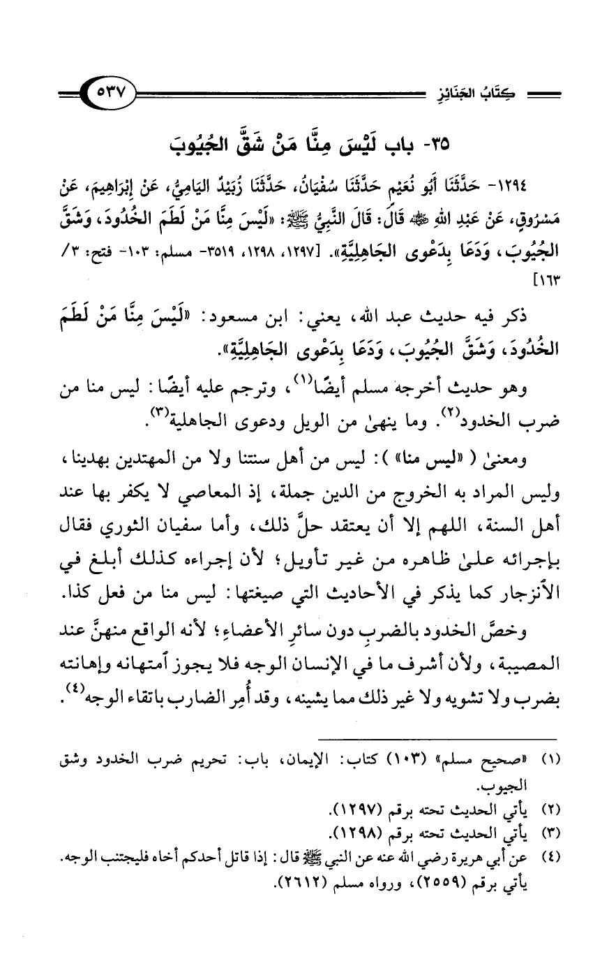 1294 - حَدَّثَنَا أَبُو نُعَيْمٍ حَدَّثَنَا سُفْيَانُ، حَدَّثَنَا زُبَيْدٌ اليَامِيُّ، عَنْ إِبْرَاهِيمَ، عَنْ مَسْرُوقٍ، عَنْ عَبْدِ اللهِ رضي الله عنه قَالَ: قَالَ النَّبِيُّ - صلى الله عليه وسلم -: "لَيْسَ مِنَّا مَنْ لَطَمَ الخُدُودَ، وَشَقَّ الجُيُوبَ، وَدَعَا بِدَعْوَى الجَاهِلِيَّةِ". [1297، 1298، 3519 - مسلم: 103 - فتح: 3/ 163]