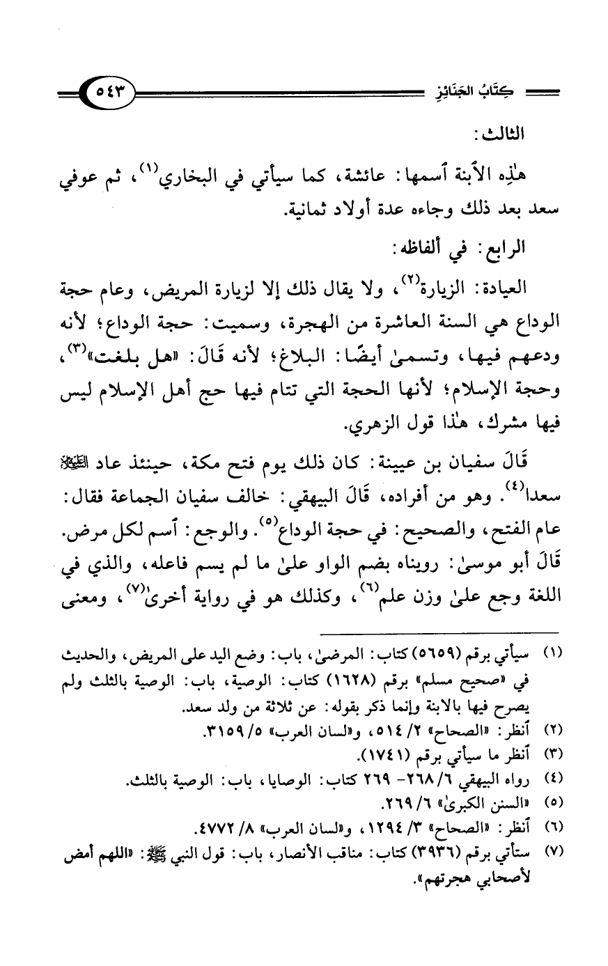 العيادة: الزيارة (¬2)، ولا يقال ذلك إلا لزيارة المريض، وعام حجة الوداع هي السنة العاشرة من الهجرة، وسميت: حجة الوداع؛ لأنه ودعهم فيها، وتسمى أيضًا: البلاغ؛ لأنه قَالَ: "هل بلغت" (¬3)، وحجة الإسلام؛ لأنها الحجة التي تتام فيها حج أهل الإسلام ليس فيها مشرك، هذا قول الزهري.