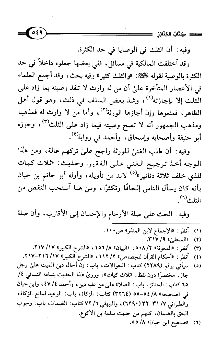 وقد اختلفت المالكية في مسائل، ففي بعضها جعلوه داخلًا في حد الكثرة بالوصية لقوله - عليه السلام -: "والثلث كثير" وفيه بحث، وقد أجمع العلماء في الأعصار المتأخرة على أن من له وارث لا تنفذ وصيته بما زاد على الثلث إلا بإجازته (¬1)، وشذ بعض السلف في ذلك، وهو قول أهل الظاهر، فمنعوها وإن أجازها الورثة (¬2)، وأما من لا وارث له فمذهبنا ومذهب الجمهور أنه لا تصح وصيته فيما زاد على الثلث (¬3)، وجوزه أبو حنيفة وأصحابه وإسحاق، وأحمد في رواية (¬4).