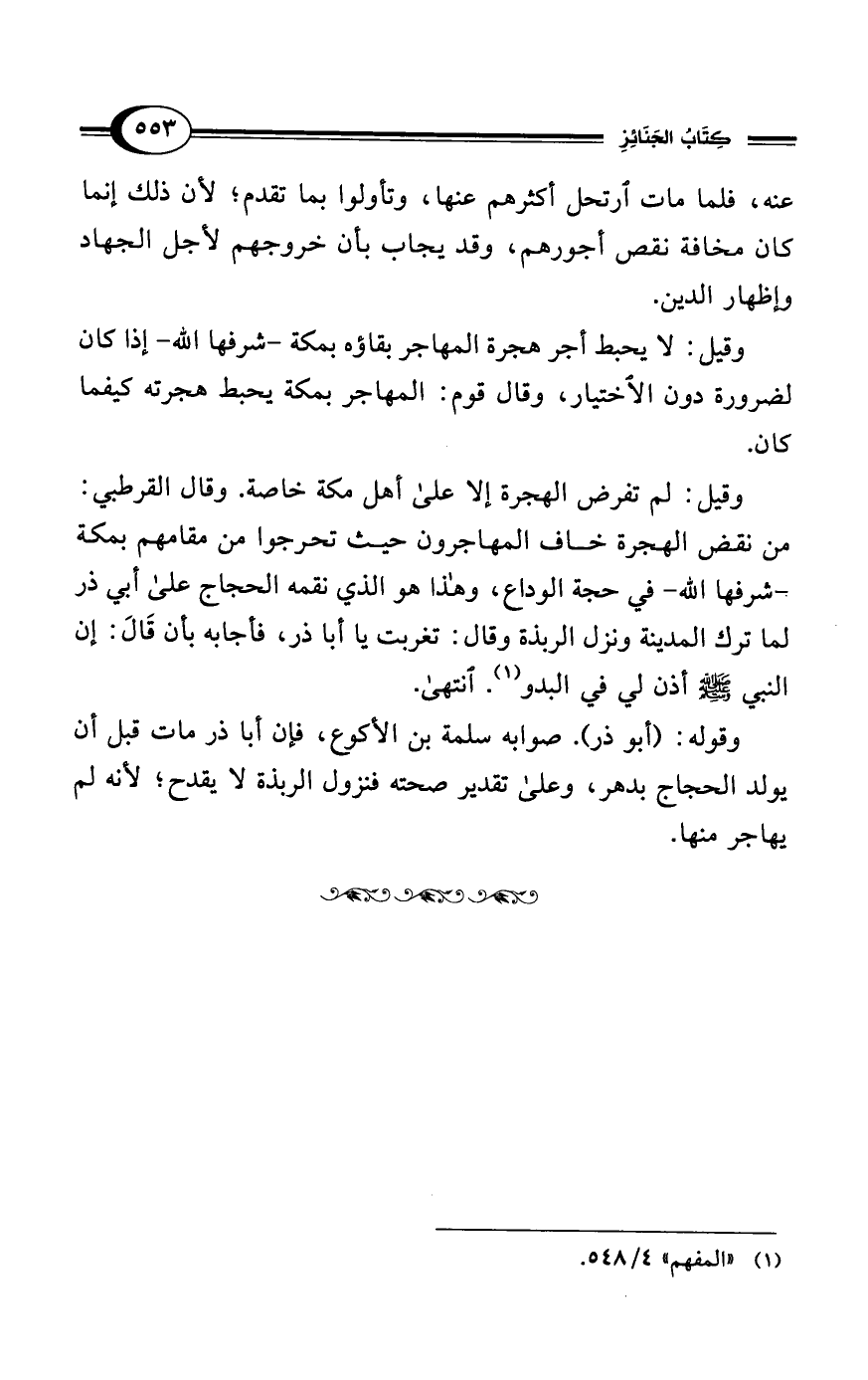 وقيل: لا يحبط أجر هجرة المهاجر بقاؤه بمكة -شرفها الله- إذا كان لضرورة دون الاختيار، وقال قوم: المهاجر بمكة يحبط هجرته كيفما كان.