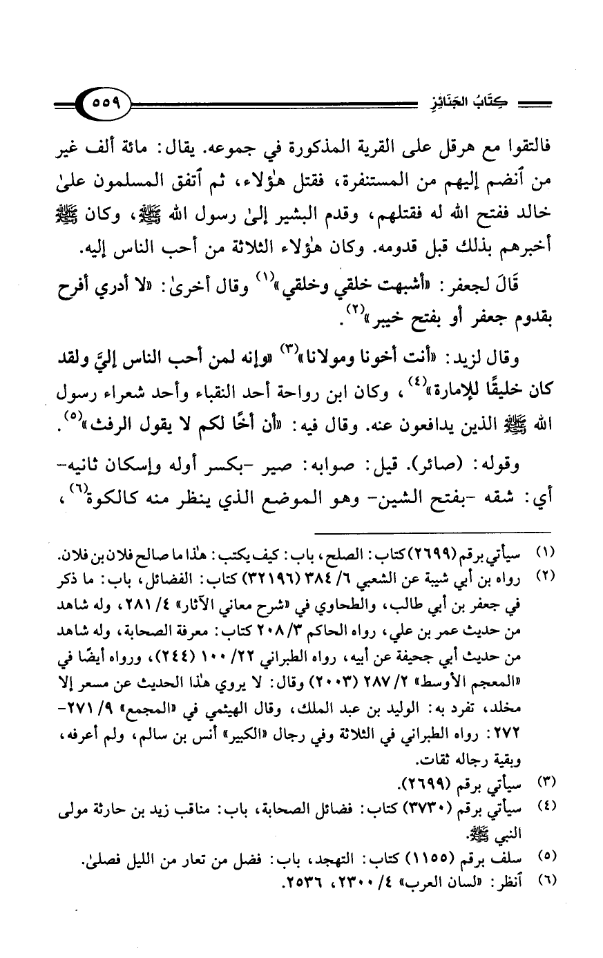 فالتقوا مع هرقل على القرية المذكورة في جموعه. يقال: مائة ألف غير من انضم إليهم من المستنفرة، فقتل هؤلاء، ثم اتفق المسلمون على خالد ففتح الله له فقتلهم، وقدم البشير إلى رسول الله - صلى الله عليه وسلم -، وكان - صلى الله عليه وسلم - أخبرهم بذلك قبل قدومه. وكان هؤلاء الثلاثة من أحب الناس إليه.