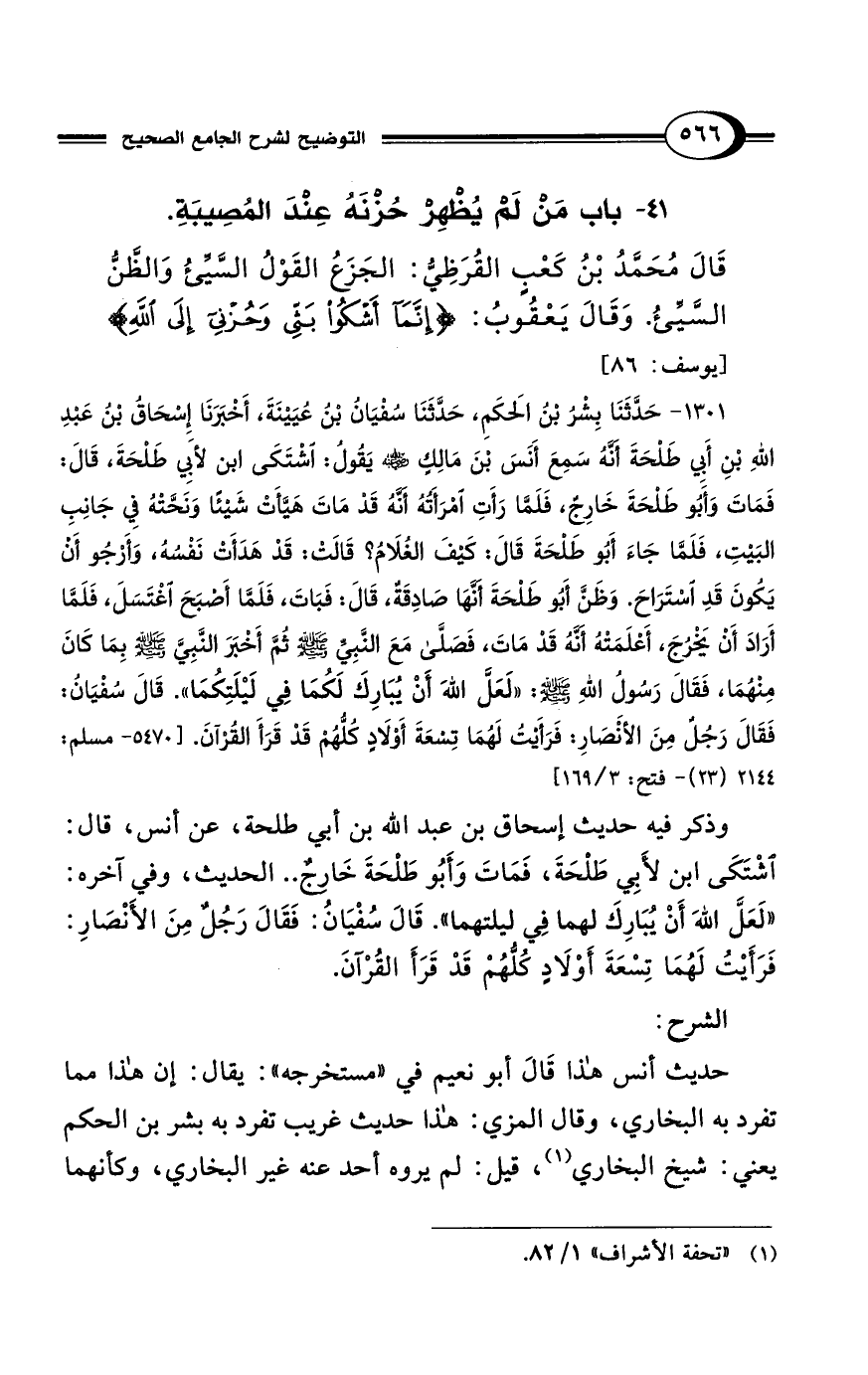 1301 - حَدَّثَنَا بِشْرُ بْنُ الحَكَمِ، حَدَّثَنَا سُفْيَانُ بْنُ عُيَيْنَةَ، أَخْبَرَنَا إِسْحَاقُ بْنُ عَبْدِ اللهِ بْنِ أَبِي طَلْحَةَ أَنَّهُ سَمِعَ أَنَسَ بْنَ مَالِكٍ - رضي الله عنه - يَقُولُ: اشْتَكَى ابْنٌ لأَبِي طَلْحَةَ، قَالَ: فَمَاتَ وَأَبُو طَلْحَةَ خَارِجٌ، فَلَمَّا رَأَتِ امْرَأَتُهُ أَنَّهُ قَدْ مَاتَ هَيَّأَتْ شَيْئًا وَنَحَّتْهُ فِي جَانِبِ البَيْتِ، فَلَمَّا جَاءَ أَبُو طَلْحَةَ قَالَ: كَيْفَ الغُلاَمُ؟ قَالَتْ: قَدْ هَدَأَتْ نَفْسُهُ، وَأَرْجُو أَنْ يَكُونَ قَدِ اسْتَرَاحَ. وَظَنَّ أَبُو طَلْحَةَ أَنَّهَا صَادِقَةٌ، قَالَ: فَبَاتَ، فَلَمَّا أَصْبَحَ اغْتَسَلَ، فَلَمَّا أَرَادَ أَنْ يَخْرُجَ، أَعْلَمَتْهُ أَنَّهُ قَدْ مَاتَ، فَصَلَّى مَعَ النَّبِيِّ - صلى الله عليه وسلم - ثُمَّ أَخْبَرَ النَّبِيَّ - صلى الله عليه وسلم - بِمَا كَانَ مِنْهُمَا، فَقَالَ رَسُولُ اللهِ - صلى الله عليه وسلم - "لَعَلَّ اللهَ أَنْ يُبَارِكَ لَكُمَا فِي لَيْلَتِكُمَا". قَالَ سُفْيَانُ: فَقَالَ رَجُلٌ مِنَ الأَنْصَارِ: فَرَأَيْتُ لَهُمَا تِسْعَةَ أَوْلاَدٍ كُلُّهُمْ قَدْ قَرَأَ القُرْآنَ. [5470 - مسلم: 2144 (23) - فتح: 3/ 169]