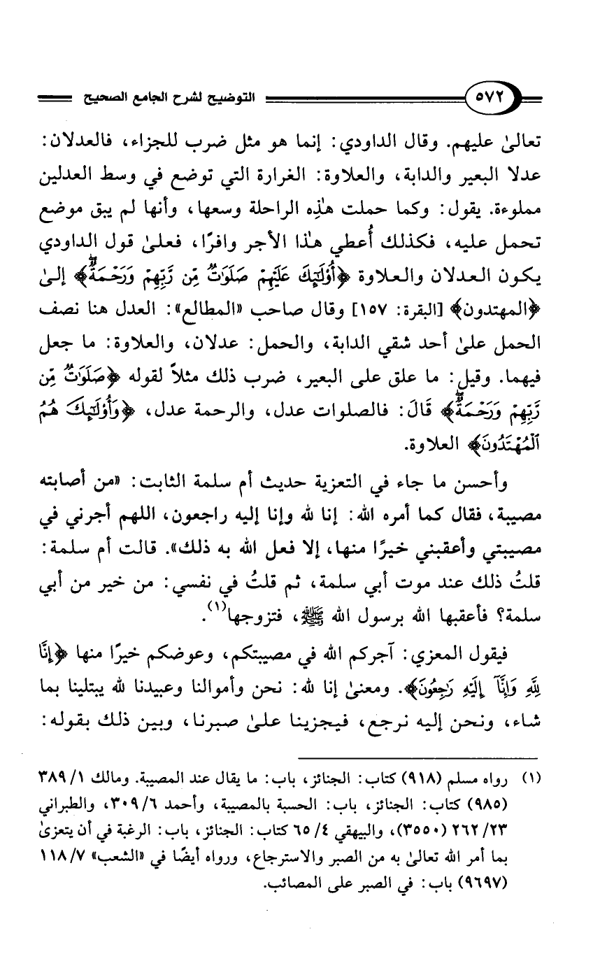 تعالى عليهم. وقال الداودي: إنما هو مثل ضرب للجزاء، فالعدلان: عدلا البعير والدابة، والعلاوة: الغرارة التي توضع في وسط العدلين مملوءة. يقول: وكما حملت هذِه الراحلة وسعها، وأنها لم يبق موضع تحمل عليه، فكذلك أُعطي هذا الأجر وافرًا، فعلى قول الداودي يكون العدلان والعلاوة {أُولَئِكَ عَلَيْهِمْ صَلَوَاتٌ مِنْ رَبِّهِمْ وَرَحْمَةٌ} إلى {المُهْتَدُونَ} [البقرة: 157] وقال صاحب "المطالع": العدل هنا نصف الحمل على أحد شقي الدابة، والحمل: عدلان، والعلاوة: ما جعل فيهما. وقيل: ما علق على البعير، ضرب ذلك مثلًا لقوله {صَلَوَاتٌ مِنْ رَبِّهِمْ وَرَحْمَةٌ} قَالَ: فالصلوات عدل، والرحمة عدل، {وَأُولَئِكَ هُمُ المُهْتَدُونَ} العلاوة.
