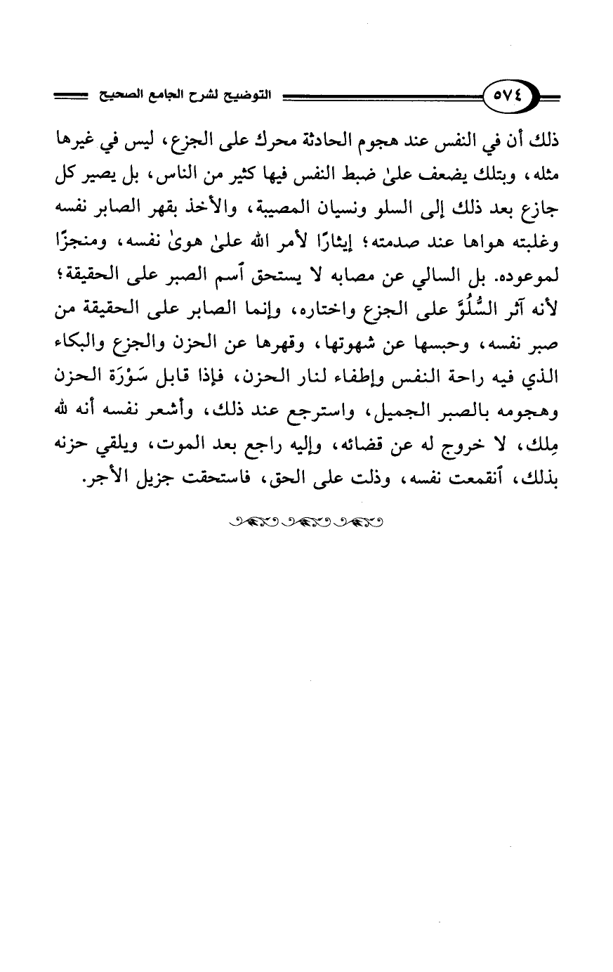 ذلك أن في النفس عند هجوم الحادثة محرك على الجزع، ليس في غيرها مثله، وبتلك يضعف على ضبط النفس فيها كثير من الناس، بل يصير كل جازع بعد ذلك إلى السلو ونسيان المصيبة، والأخذ بقهر الصابر نفسه وغلبته هواها عند صدمته؛ إيثارًا لأمر الله على هوى نفسه، ومنجزًا لموعوده. بل السالي عن مصابه لا يستحق اسم الصبر على الحقيقة؛ لأنه آثر السُّلُوَّ على الجزع واختاره، وإنما الصابر على الحقيقة من صبر نفسه، وحبسها عن شهوتها، وقهرها عن الحزن والجزع والبكاء الذي فيه راحة النفسس وإطفاء لنار الحزن، فإذا قابل سَوْرَة الحزن وهجومه بالصبر الجميل، واسترجع عند ذلك، وأشعر نفسه أنه لله مِلك، لا خروج له عن قضائه، وإليه راجع بعد الموت، ويلقي حزنه بذلك، انقمعت نفسه، وذلت على الحق، فاستحقت جزيل الأجر.