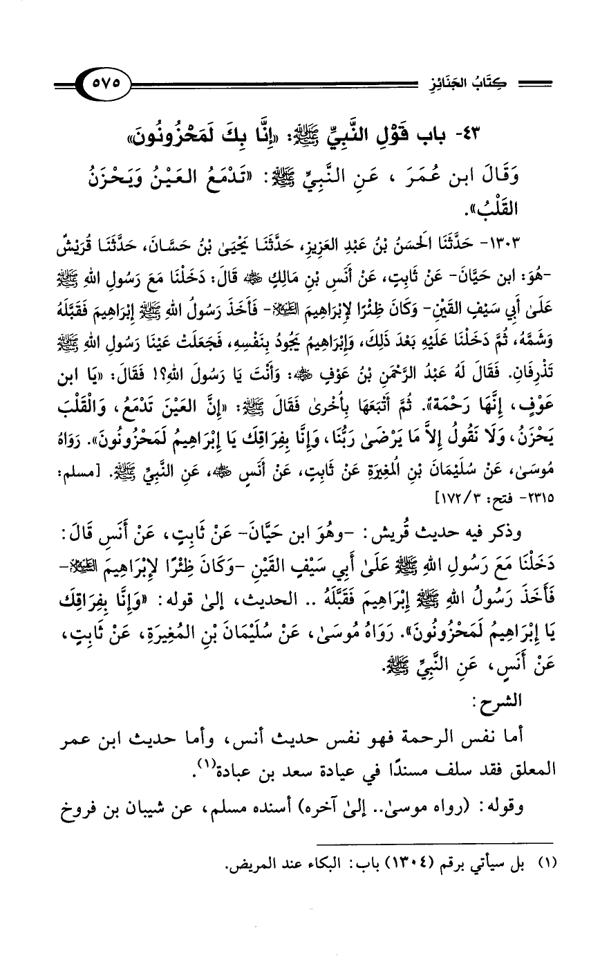 1303 - حَدَّثَنَا الحَسَنُ بْنُ عَبْدِ العَزِيزِ، حَدَّثَنَا يَحْيَى بْنُ حَسَّانَ، حَدَّثَنَا قُرَيْشٌ -هُوَ: ابْنُ حَيَّانَ- عَنْ ثَابِتٍ، عَنْ أَنَسِ بْنِ مَالِكٍ - رضي الله عنه - قَالَ: دَخَلْنَا مَعَ رَسُولِ اللهِ - صلى الله عليه وسلم - عَلَى أَبِي سَيْفٍ القَيْنِ -وَكَانَ ظِئْرًا لإِبْرَاهِيمَ - عَلَيْهِ السَّلاَمُ -- فَأَخَذَ رَسُولُ اللهِ - صلى الله عليه وسلم - إِبْرَاهِيمَ فَقَبَّلَهُ، وَشَمَّهُ، ثُمَّ دَخَلْنَا عَلَيْهِ بَعْدَ ذَلِكَ، وَإِبْرَاهِيمُ يَجُودُ بِنَفْسِهِ، فَجَعَلَتْ عَيْنَا رَسُولِ اللهِ - صلى الله عليه وسلم - تَذْرِفَانِ. فَقَالَ لَهُ عَبْدُ الرَّحْمَنِ بْنُ عَوْفٍ - رضي الله عنه -: وَأَنْتَ يَا رَسُولَ اللهِ؟! فَقَالَ: "يَا ابْنَ عَوْفٍ، إِنَّهَا رَحْمَةٌ". ثُمَّ أَتْبَعَهَا بِأُخْرَى فَقَالَ - صلى الله عليه وسلم -: "إِنَّ العَيْنَ تَدْمَعُ، وَالقَلْبَ يَحْزَنُ، وَلاَ نَقُولُ إِلاَّ مَا يَرْضَى رَبُّنَا، وَإِنَّا بِفِرَاقِكَ يَا إِبْرَاهِيمُ لَمَحْزُونُونَ". رَوَاهُ مُوسَى، عَنْ سُلَيْمَانَ بْنِ المُغِيرَةِ عَنْ ثَابِتٍ، عَنْ أَنَسٍ - رضي الله عنه -، عَنِ النَّبِيِّ - صلى الله عليه وسلم -. [مسلم: 2315 - فتح: 3/ 172]