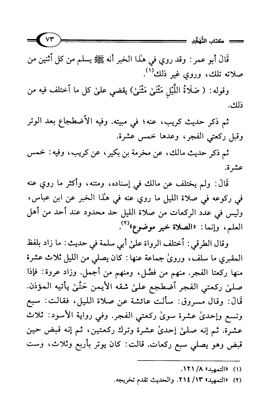 قَالَ: ولم يختلف عن مالك في إسناده، ومتنه، وأكثر ما روي عنه في ركوعه في صلاة الليل ما روي عنه في هذا الخبر عن ابن عباس، وليس في عدد الركعات من صلاة الليل حد محدود عند أحد من أهل العلم، وإنما: "الصلاة خير موضوع" (¬2).