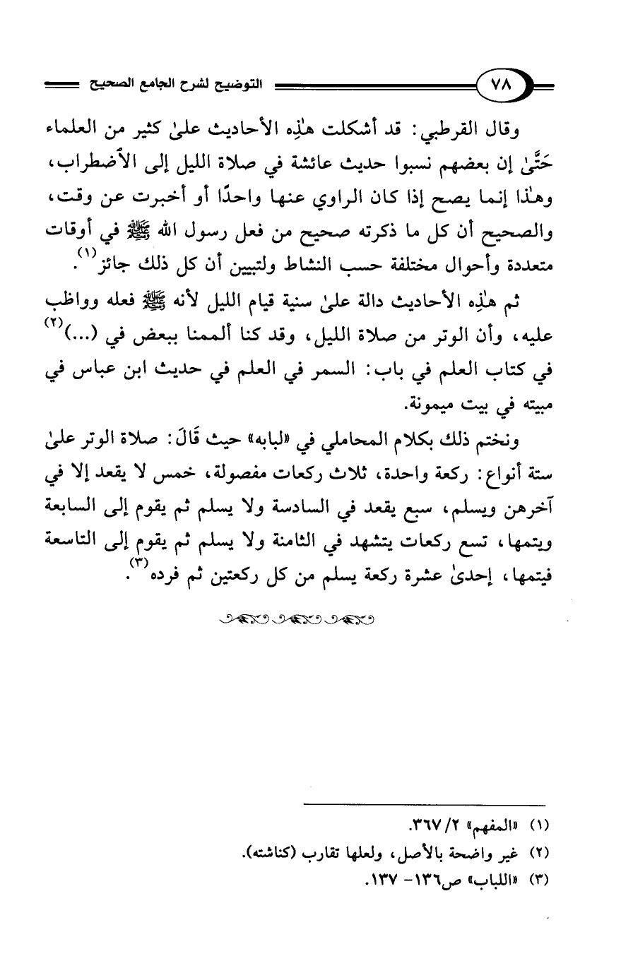 وقال القرطبي: قد أشكلت هذِه الأحاديث على كثير من العلماء حَتَّى إن بعضهم نسبوا حديث عائشة في صلاة الليل إلى الاضطراب، وهذا إنما يصح إذا كان الراوي عنها واحدًا أو أخبرت عن وقت، والصحيح أن كل ما ذكرته صحيح من فعل رسول الله - صلى الله عليه وسلم - في أوقات متعددة وأحوال مختلفة حسب النشاط ولتبيين أن كل ذلك جائز (¬1).