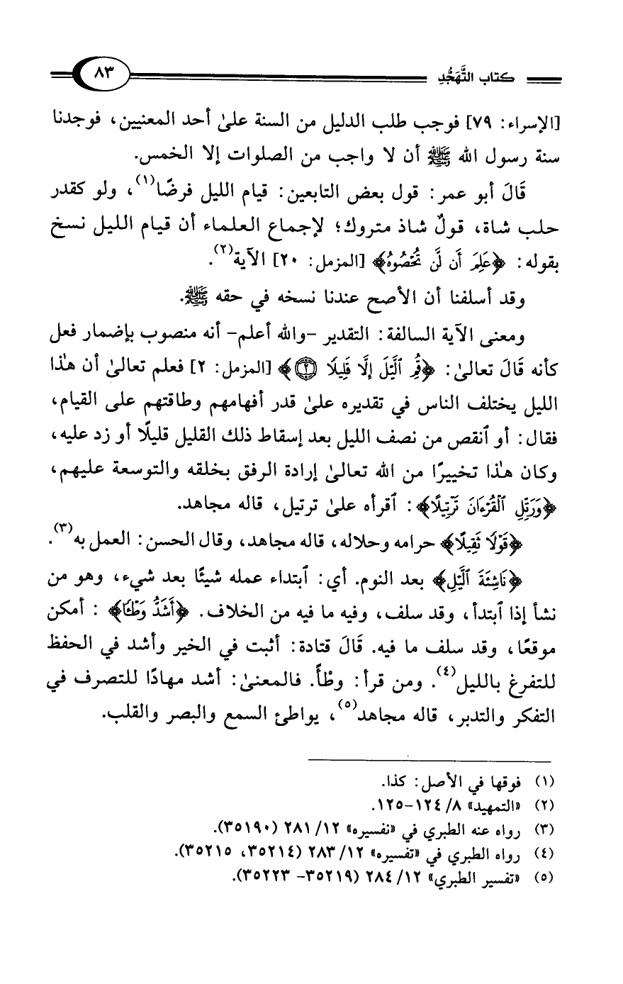 [الإسراء: 79] فوجب طلب الدليل من السنة على أحد المعنيين، فوجدنا سنة رسول الله - صلى الله عليه وسلم - أن لا واجب من الصلوات إلا الخمس.