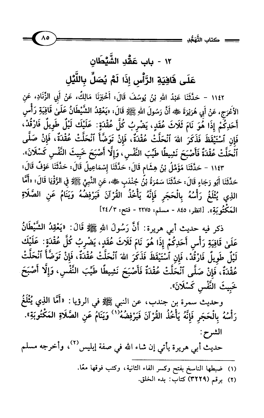 ذكر فيه حديث أبي هريرة: أَنَّ رَسُولَ اللهِ - صلى الله عليه وسلم - قَالَ: "يَعْقِدُ الشَّيْطَانُ عَلَى قَافِيَةِ رَأْسِ أَحَدِكُمْ إِذَا هُوَ نَامَ ثَلَاثَ عُقَدٍ، يَضْرِبُ كُلَّ عُقْدَةٍ: عَلَيْكَ لَيْلٌ طَوِيلٌ فَارْقُدْ، فَإِنِ اسْتَيْقَظَ فَذَكَرَ اللهَ انْحَلَّتْ عُقْدَةٌ، فَإِنْ تَوَضَّأَ انْحَلَّتْ عُقْدَة، فَإِنْ صَلَّى انْحَلَّتْ عُقْدَةٌ فَأَصْبَحَ نَشِيطًا طَيِّبَ النَّفْسِ، وَإِلَّا أَصْبَحَ خَبِيثَ النَّفْسِ كسْلَانَ".
