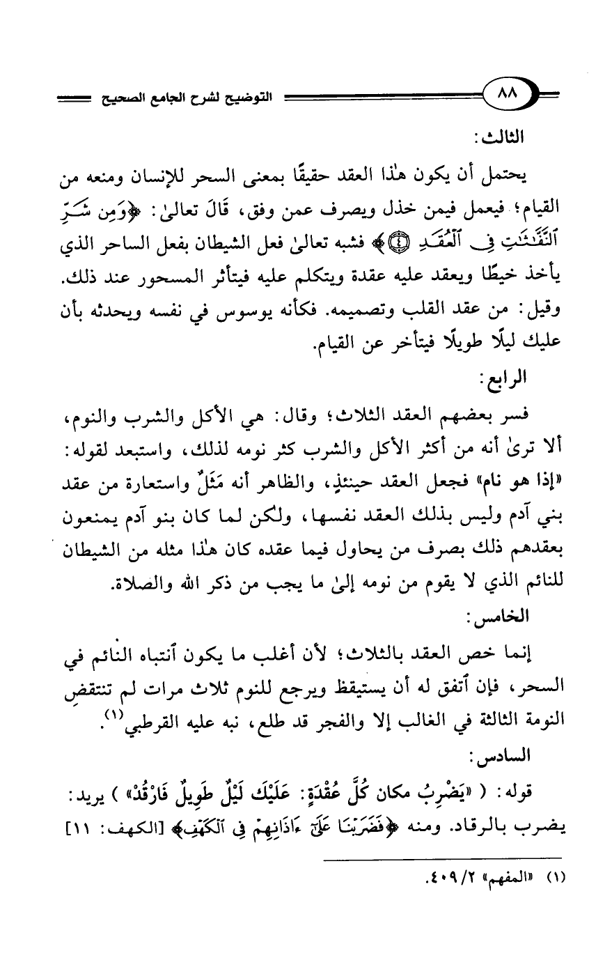 فسر بعضهم العقد الثلاث؛ وقال: هي الأكل والشرب والنوم، ألا ترى أنه من أكثر الأكل والشرب كثر نومه لذلك، واستبعد لقوله: "إذا هو نام" فجعل العقد حينئذٍ، والظاهر أنه مَثَلٌ واستعارة من عقد بني آدم وليس بذلك العقد نفسها، ولكن لما كان بنو آدم يمنعون بعقدهم ذلك بصرف من يحاول فيما عقده كان هذا مثله من الشيطان للنائم الذي لا يقوم من نومه إلى ما يجب من ذكر الله والصلاة.