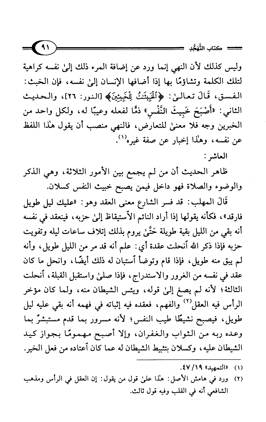 قَالَ المهلب: قد فسر الشارع معنى العقد وهو: "عليك ليل طويل فارقد"، فكأنه يقولها إذا أراد النائم الاستيقاظ إلى حزبه، فينعقد في نفسه أنه بقي من الليل بقية طويلة حَتَّى يروم بذلك إتلاف ساعات ليله وتفويت حزبه فإذا ذكر الله انحلت عقدة أي: علم أنه قد مر من الليل طويل، وأنه لم يبق منه طويل، فإذا قام وتوضأ استبان له ذلك أيضًا، وانحل ما كان عقد في نفسه من الغرور والاستدراج، فإذا صلى واستقبل القبلة، انحلت الثالثة؛ لأنه لم يصغ إلى قوله، ويئس الشيطان منه، ولما كان مؤخر الرأس فيه العقل (¬2) والفهم، فعقده فيه إثباته في فهمه أنه بقي عليه ليل طويل، فيصبح نشيطًا طيب النفس؛ لأنه مسرور بما قدم مستبشرٌ بما وعده ربه من الثواب والغفران، وإلا أصبح مهمومًا بجواز كيد الشيطان عليه، وكسلان بتثبيط الشيطان له عما كان اعتاده من فعل الخير.