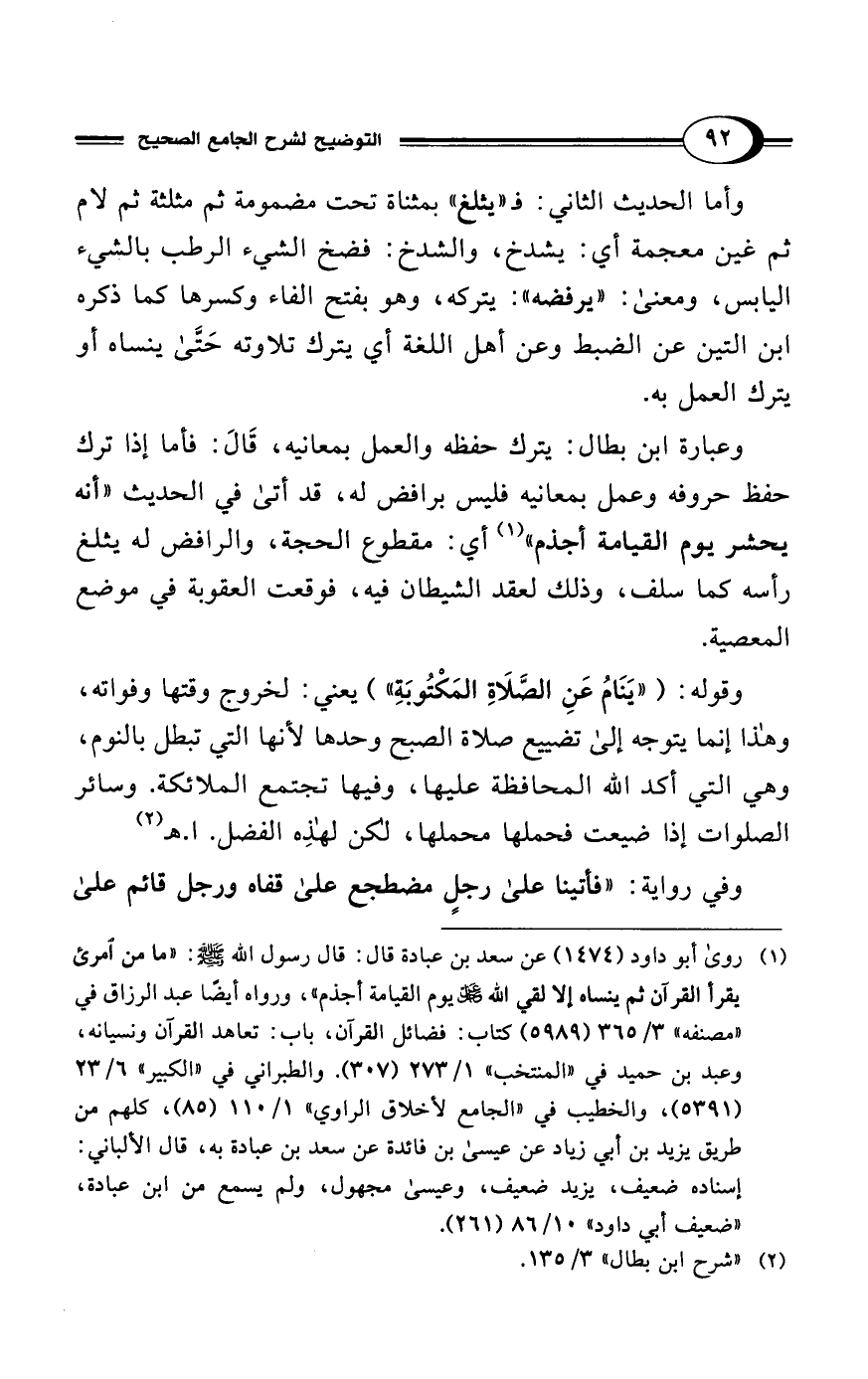 وعبارة ابن بطال: يترك حفظه والعمل بمعانيه، قَالَ: فأما إذا ترك حفظ حروفه وعمل بمعانيه فليس برافض له، قد أتى في الحديث "أنه بحشر يوم القيامة أجذم" (¬1) أي: مقطوع الحجة، والرافض له يثلغ رأسه كما سلف، وذلك لعقد الشيطان فيه، فوقعت العقوبة في موضع المعصية.