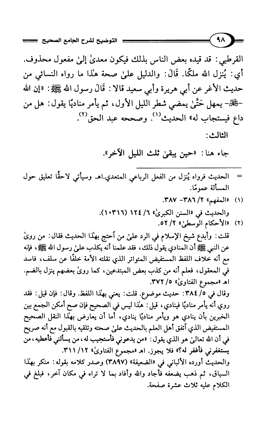 قلت: وأبدع شيخ الإسلام في الرد على من احتج بهذا الحديث فقال: من روى عن النبي - صلى الله عليه وسلم - أن المنادي يقول ذلك، فقد علمنا أنه يكذب على رسول الله - صلى الله عليه وسلم -، فإنه مع أنه خلاف اللفظ المستفيض المتواتر الذي نقلته الأمة خلفًا عن سلف، فاسد في المعقول، فعلم أنه من كذب بعض المبتدعين، كما روى بعضهم ينزل بالضم. اهـ "مجموع الفتاوى" 5/ 372.