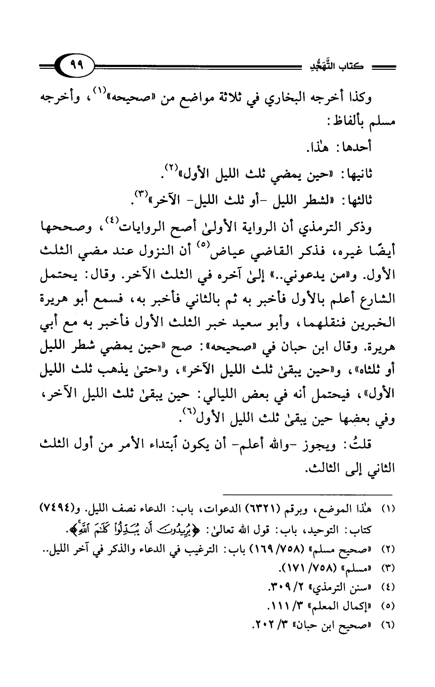 وذكر الترمذي أن الرواية الأولى أصح الروايات (¬4)، وصححها أيضًا غيره، فذكر القاضي عياض (¬5) أن النزول عند مضي الثلث الأول. و"من يدعوني .. " إلى آخره في الثلث الآخر. وقال: يحتمل الشارع أعلم بالأول فأخبر به ثم بالثاني فأخبر به، فسمع أبو هريرة الخبرين فنقلهما، وأبو سعيد خبر الثلث الأول فأخبر به مع أبي هريرة. وقال ابن حبان في "صحيحه": صح "حين يمضي شطر الليل أو ثلثاه"، و"حين يبقى ثلث الليل الآخر"، و"حتى يذهب ثلث الليل الأول"، فيحتمل أنه في بعض الليالي: حين يبقى ثلث الليل الآخر، وفي بعضها حين يبقى ثلث الليل الأول (¬6).