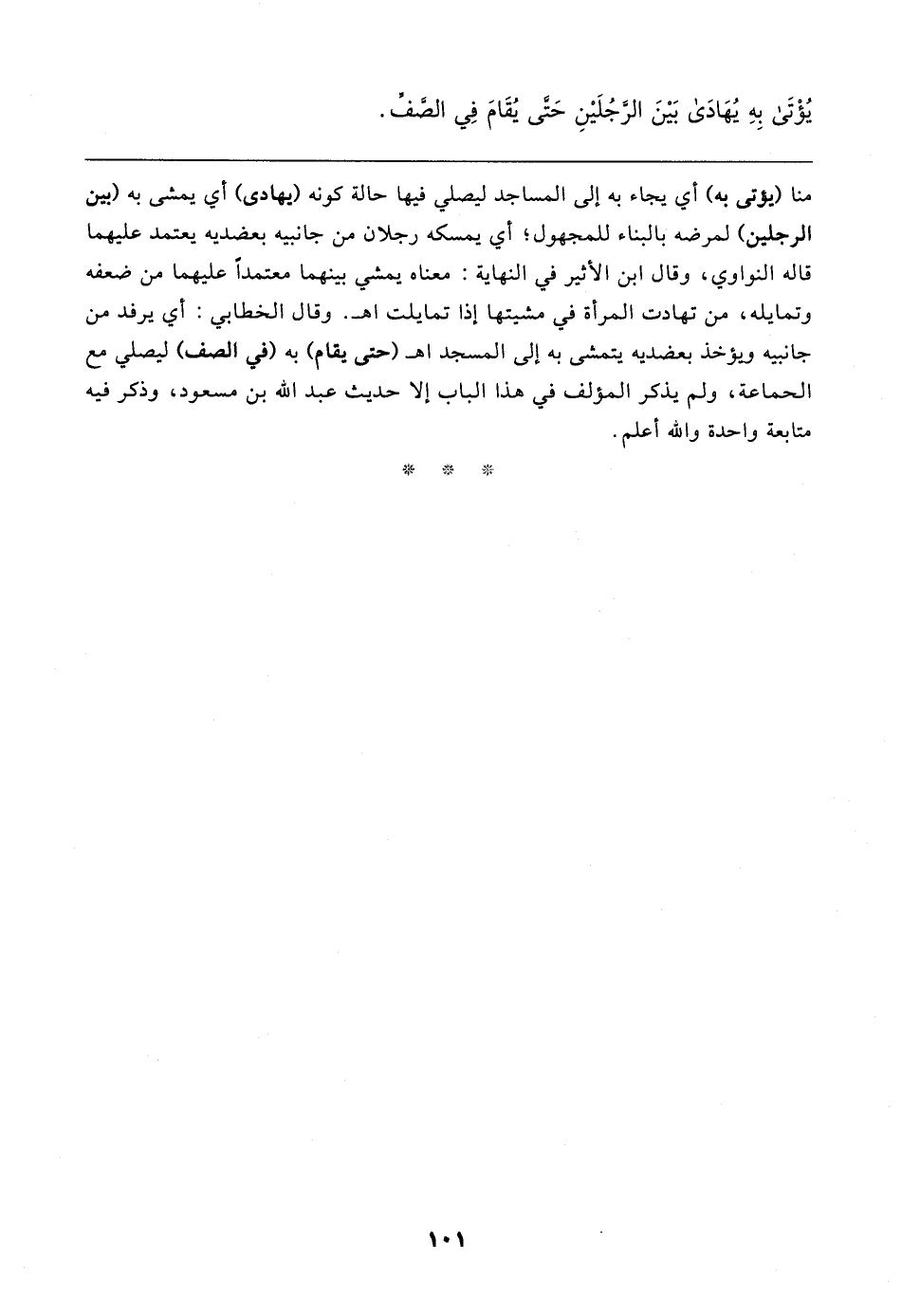 منا (يؤتى به) أي يجاء به إلى المساجد ليصلي فيها حالة كونه (يهادى) أي يمشي به (بين الرجلين) لمرضه بالبناء للمجهول؛ أي يمسكه رجلان من جانبيه بعضديه يعتمد عليهما قاله النواوي، وقال ابن الأثير في النهاية: معناه يمشي بينهما معتمدًا عليهما من ضعفه وتمايله، من تهادت المرأة في مشيتها إذا تمايلت اهـ. وقال الخطابي: أي يرفد من جانبيه ويؤخذ بعضديه يتمشى به إلى المسجد اهـ (حتَّى يقام) به (في الصف) ليصلي مع الجماعة، ولم يذكر المؤلف في هذا الباب إلَّا حديث عبد الله بن مسعود، وذكر فيه متابعة واحدة والله أعلم.