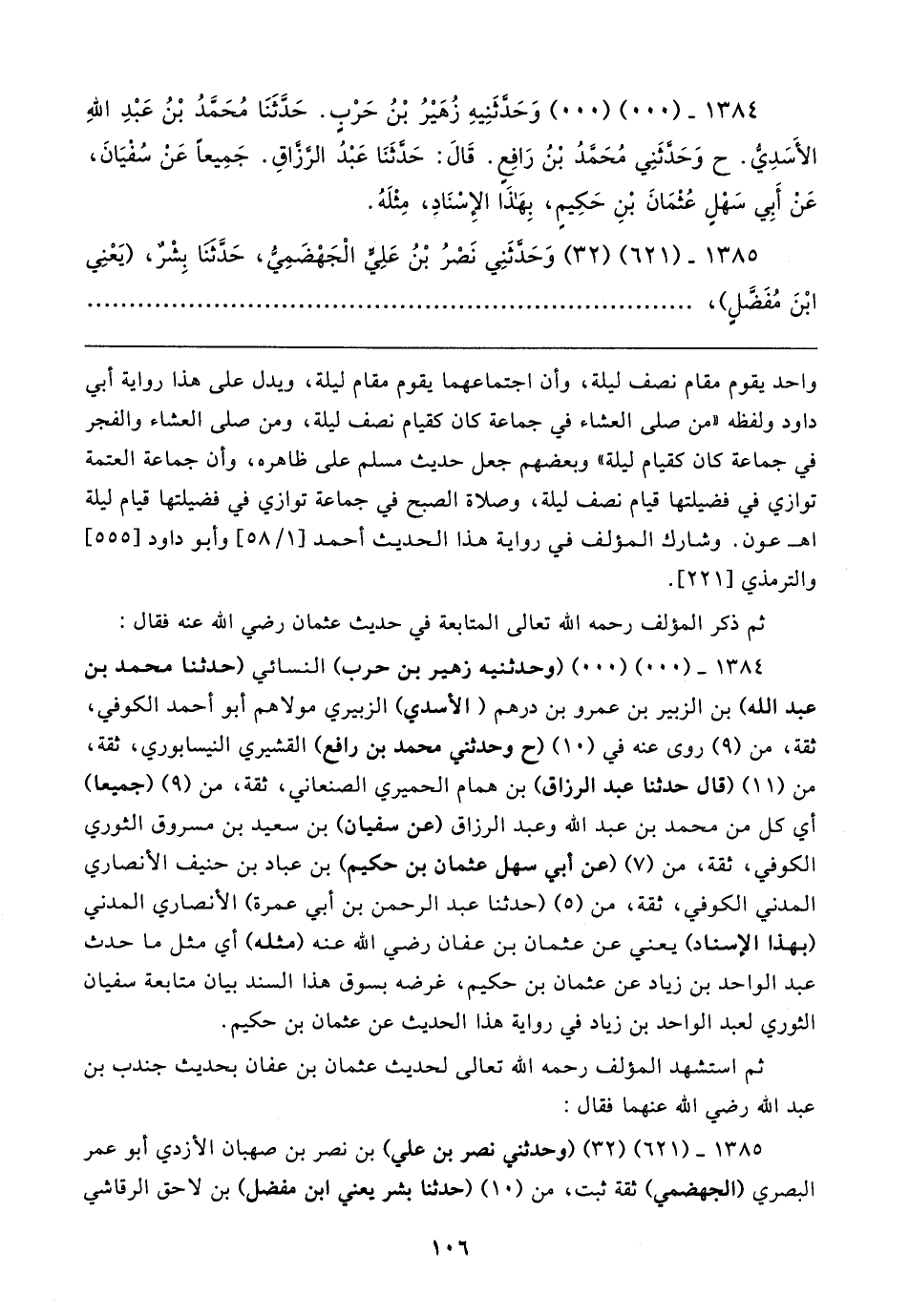 ١٣٨٤ - (٠٠) (٠٠) (وحدثنيه زهير بن حرب) النَّسائيّ (حدَّثنا محمَّد بن عبد الله) بن الزُّبير بن عمرو بن درهم (لأسدي) الزبيري مولاهم أبو أحمد الكوفيّ، ثقة، من (٩) روى عنه في (١٠) (ح وحدثني محمَّد بن رافع) القشيري النيسابوري، ثقة، من (١١) (قال حدَّثنا عبد الرَّزاق) بن همام الحميري الصنعاني، ثقة، من (٩) (جميعًا) أي كل من محمَّد بن عبد الله وعبد الرَّزاق (عن سفيان) بن سعيد بن مسروق الثوري الكوفيّ، ثقة، من (٧) (عن أبي سهل عثمان بن حكيم) بن عباد بن حنيف الأنصاري المدني الكوفيّ، ثقة، من (٥) (حدَّثنا عبد الرحمن بن أبي عمرة) الأنصاري المدني (بهذا الإسناد) يعني عن عثمان بن عفَّان رضي الله عنه (مثله) أي مثل ما حدث عبد الواحد بن زياد عن عثمان بن حكيم، غرضه بسوق هذا السند بيان متابعة سفيان الثوري لعبد الواحد بن زياد في رواية هذا الحديث عن عثمان بن حكيم.