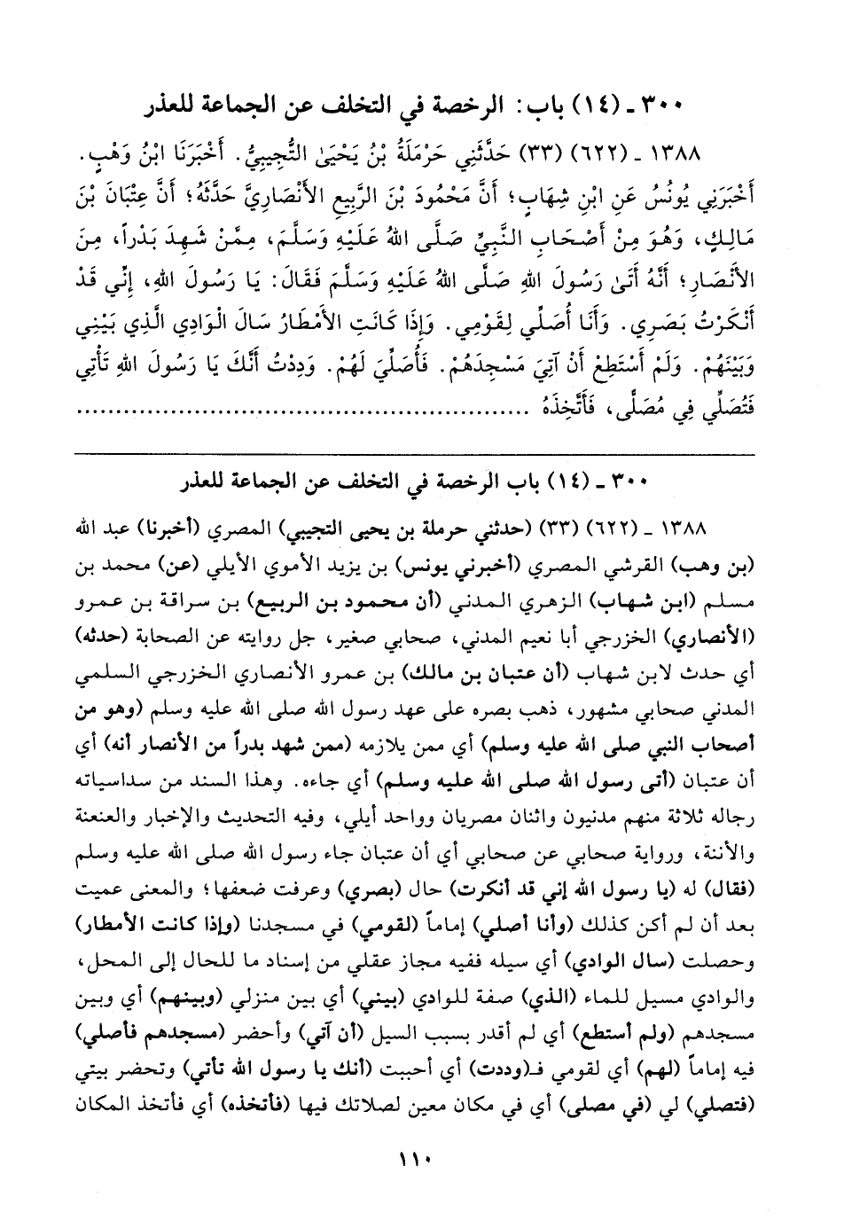 ١٣٨٨ - (٦٢٢) (٣٣) (حدثني حرملة بن يَحْيَى التجيبي) المصري (أخبرنا) عبد الله (بن وهب) القرشي المصري (أخبرني يونس) بن يزيد الأموي الأيلي (عن) محمَّد بن مسلم (ابن شهاب) الزُّهريّ المدني (أن محمود بن الرَّبيع) بن سراقة بن عمرو (الأنصاري) الخزرجي أبا نعيم المدني، صحابي صغير، جل روايته عن الصّحابة (حديثه) أي حدث لابن شهاب (أن عتبان بن مالك) بن عمرو الأنصاري الخزرجي السلمي المدني صحابي مشهور، ذهب بصره على عهد رسول الله صَلَّى الله عليه وسلم (وهو من أصحاب النَّبيِّ صَلَّى الله عليه وسلم) أي ممن يلازمه (ممن شهد بدرًا من الأنصار أنَّه) أي أن عتبان (أتى رسول الله صَلَّى الله عليه وسلم) أي جاءه. وهذا السند من سداسياته رجاله ثلاثة منهم مدنيون واثنان مصريان وواحد أيلي، وفيه التحديث والإخبار والعنعنة والأننة، ورواية صحابي عن صحابي أي أن عتبان جاء رسول الله صَلَّى الله عليه وسلم (فقال) له (يا رسول الله إنِّي قد أنكرت) حال (بصري) وعرفت ضعفها؛ والمعنى عميت بعد أن لم أكن كذلك (وأنا أصلي) إمامًا (لقومي) في مسجدنا (وإذا كانت الأمطار) وحصلت (سال الوادي) أي سيله ففيه مجاز عقلي من إسناد ما للحال إلى المحل، والوادي مسيل للماء (الذي) صفة للوادي (بيني) أي بين منزلي (وبينهم) أي وبين مسجدهم (ولم أستطع) أي لم أقدر بسبب السيل (أن آتي) وأحضر (مسجدهم فأصلي) فيه إمامًا (لهم) أي لقومي فـ (وددت) أي أحببت (أنك يا رسول الله تأتي) وتحضر بيتي (فتصلي) لي (في مصلى) أي في مكان معين لصلاتك فيها (فأتخذه) أي فأتخذ المكان