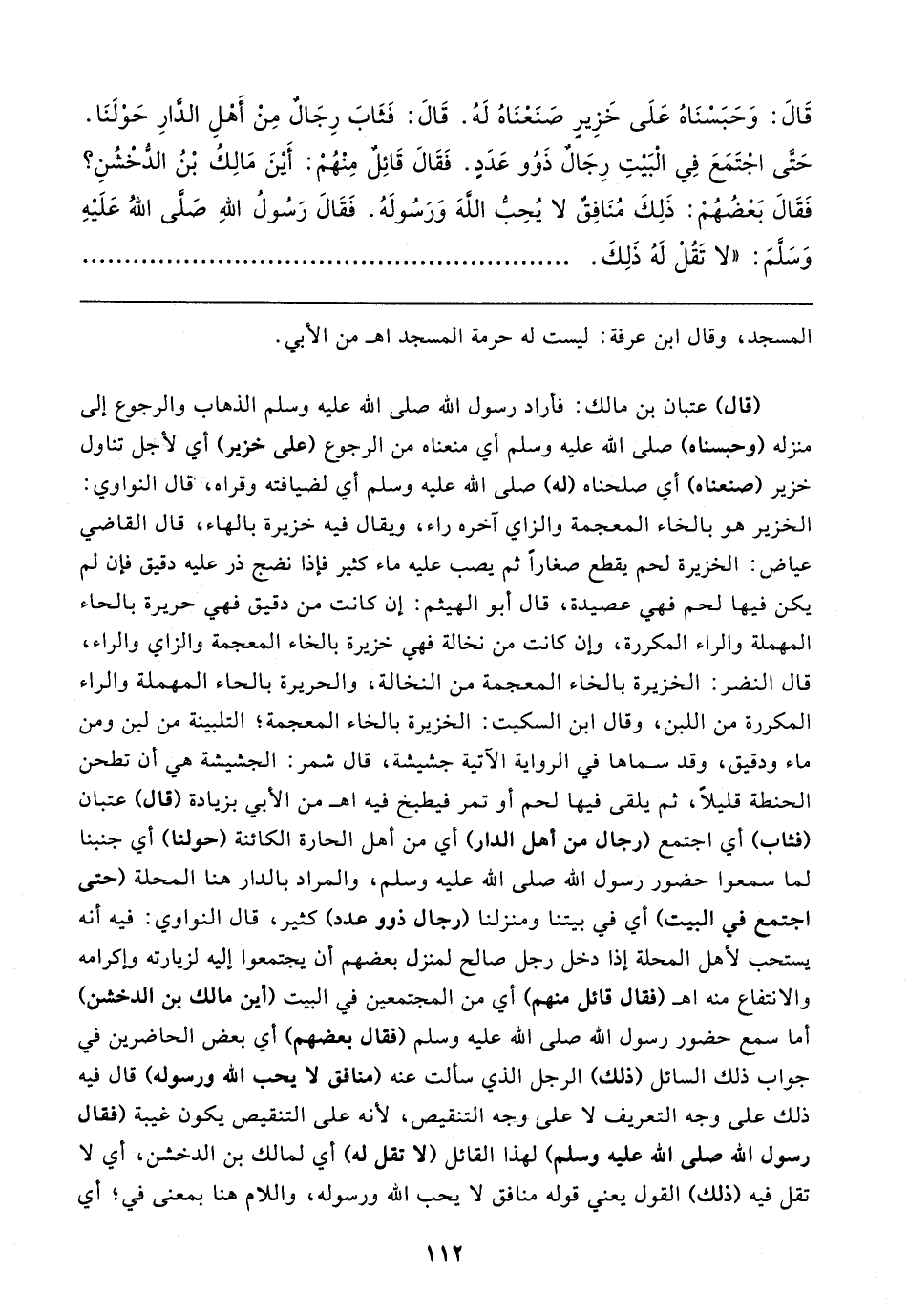 قَال: وَحَبَسْنَاهُ عَلَى خَزِيرٍ صَنَعْنَاهُ لَهُ. قَال: فَثَابَ رِجَالٌ مِنْ أَهْلِ الدَّارِ حَوْلَنَا. حَتَّى اجْتَمَعَ فِي الْبَيتِ رِجَالٌ ذَوُو عَدَدٍ. فَقَال قَائلٌ مِنْهُمْ: أينَ مَالِكُ بْنُ الدُّخْشُنِ؟ فَقَال بَعْضُهُمْ: ذَلِكَ مُنَافِقٌ لا يُحِبُّ اللهَ وَرَسُولَهُ. فَقَال رَسُولُ اللهِ صَلَّى اللهُ عَلَيهِ وَسَلَّمَ: "لا تَقُلْ لَهُ ذَلِكَ