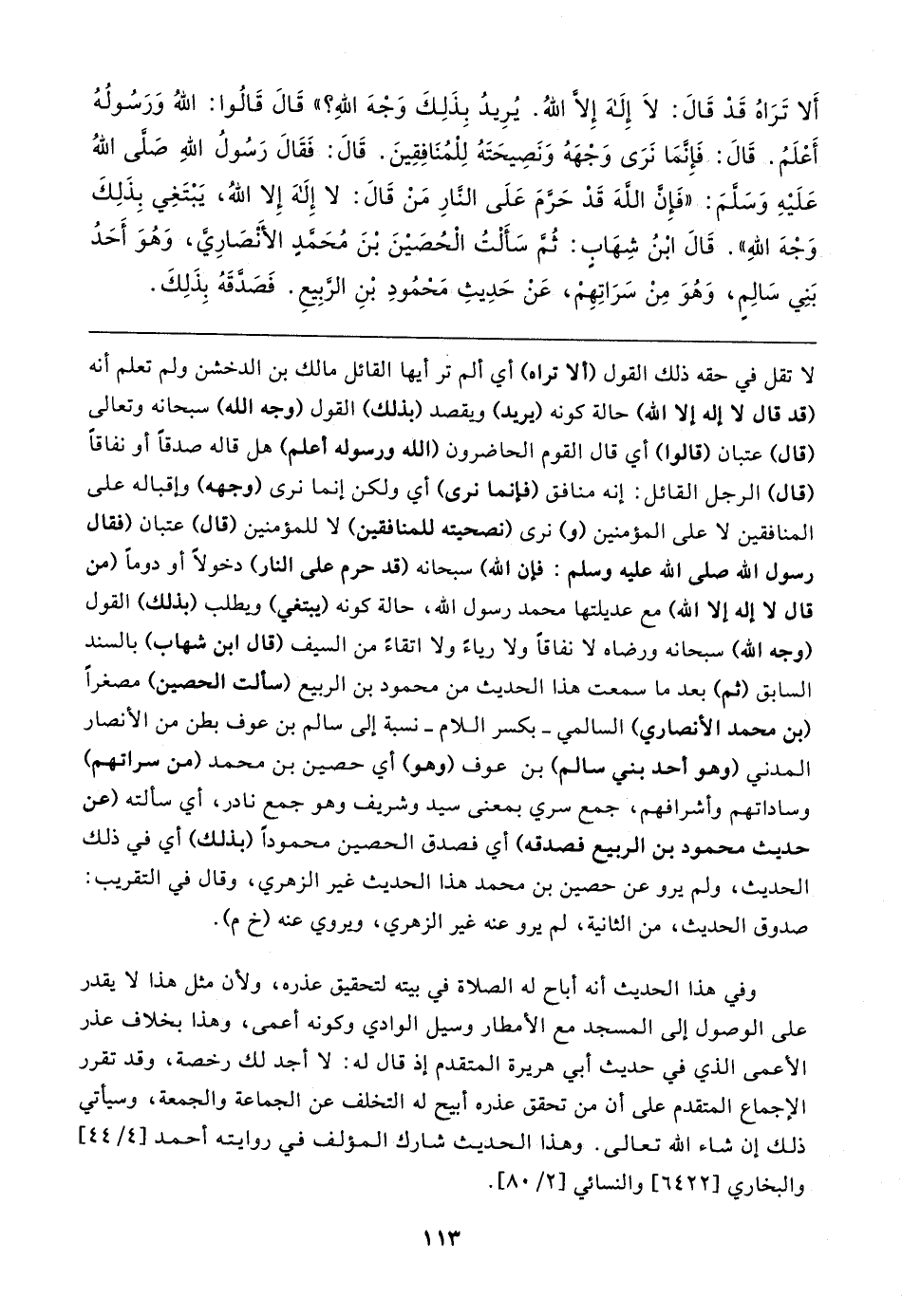 أَلا تَرَاهُ قَدْ قَال: لَا إِلَهَ إلا اللهُ. يُرِيدُ بِذَلِكَ وَجْهَ اللهِ؟ " قَال قَالُوا: اللهُ وَرَسُولُهُ أَعْلَمُ. قَال: فَإِنَّمَا نَرَى وَجْهَهُ وَنَصِيحَتَهُ لِلْمُنَافِقِينَ. قَال: فَقَال رَسُولُ اللهِ صَلَّى اللهُ عَلَيهِ وَسَلَّمَ: "فَإِن اللهَ قَدْ حَرَّمَ عَلَى النَّارِ مَنْ قَال: لا إِلَهَ إِلا اللهُ، يَبْتَغِي بِذَلِكَ وَجْهَ اللهِ". قَال ابْنُ شِهَاب: ثُمَّ سَأَلْتُ الْحُصَينَ بْنَ مُحَمَّدٍ الأَنْصَارِيَّ، وَهُوَ أَحَدُ بَنِي سَالِمٍ، وَهُوَ مِنْ سَرَاتِهِمْ، عَنْ حَدِيثِ مَحْمُودِ بْنِ الرَّبِيعِ. فَصَدَّقَهُ بِذَلِكَ