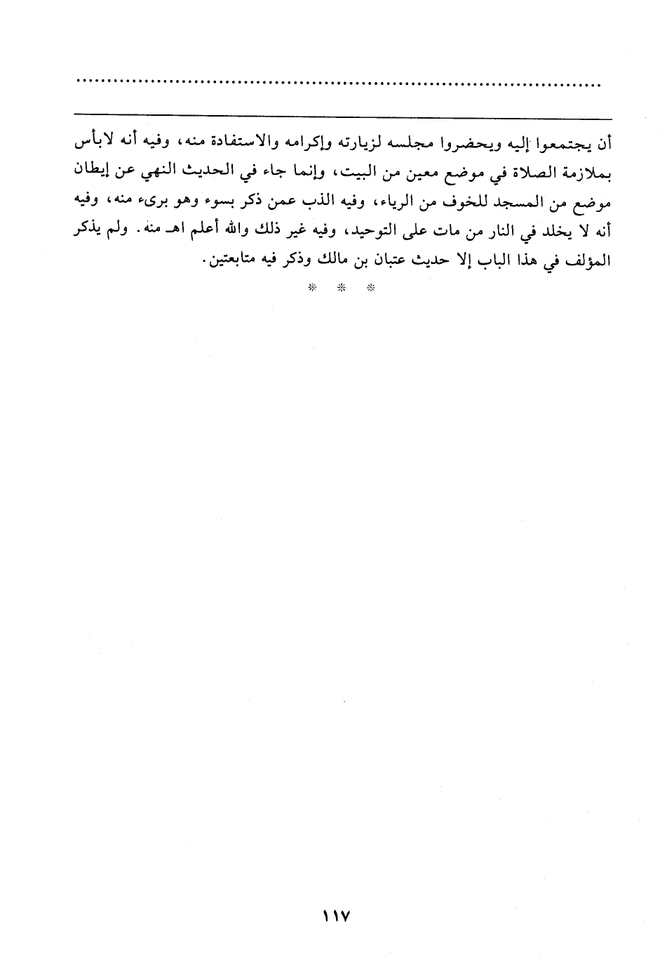 أن يجتمعوا إليه ويحضروا مجلسه لزيارته وإكرامه والاستفادة منه، وفيه أنه لا بأس بملازمة الصلاة في موضع معين من البيت، وإنما جاء في الحديث النهي عن إيطان موضع من المسجد للخوف من الرياء، وفيه الذب عمن ذكر بسوء وهو برئ منه، وفيه أنه لا يخلد في النار من مات على التوحيد، وفيه غير ذلك والله أعلم اهـ منه. ولم يذكر المؤلف في هذا الباب إلا حديث عتبان بن مالك وذكر فيه متابعتين.