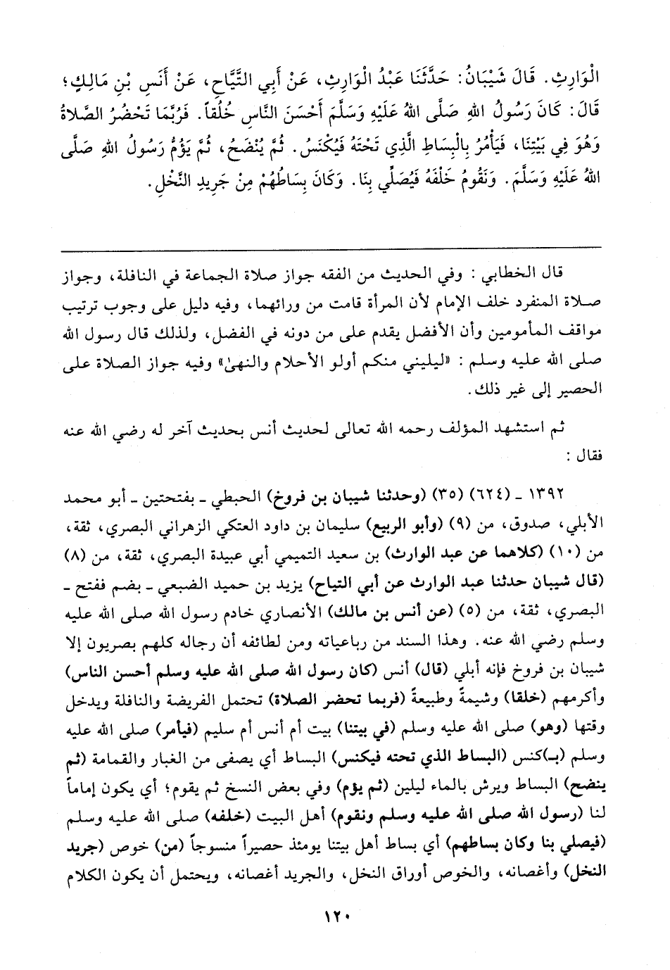 ١٣٩٢ - (٦٢٤) (٣٥) (وحدثنا شيبان بن فروخ) الحبطي -بفتحتين- أبو محمد الأبلي، صدوق، من (٩) (وأبو الربيع) سليمان بن داود العتكي الزهراني البصري، ثقة، من (١٠) (كلاهما عن عبد الوارث) بن سعيد التميمي أبي عبيدة البصري، ثقة، من (٨) (قال شيبان حدثنا عبد الوارث عن أبي التياح) يزيد بن حميد الضبعي -بضم ففتح- البصري، ثقة، من (٥) (عن أنس بن مالك) الأنصاري خادم رسول الله صلى الله عليه وسلم رضي الله عنه. وهذا السند من رباعياته ومن لطائفه أن رجاله كلهم بصريون إلا شيبان بن فروخ فإنه أبلي (قال) أنس (كان رسول الله صلى الله عليه وسلم أحسن الناس) وأكرمهم (خلقا) وشيمةً وطبيعة (فربما تحضر الصلاة) تحتمل الفريضة والنافلة ويدخل وقتها (وهو) صلى الله عليه وسلم (في بيتنا) بيت أم أنس أم سليم (فيأمر) صلى الله عليه وسلم (بـ) كنس (البساط الذي تحته فيكنس) البساط أي يصفى من الغبار والقمامة (ثم ينضح) البساط ويرش بالماء ليلين (ثم يؤم) وفي بعض النسخ ثم يقوم؛ أي يكون إمامًا لنا (رسول الله صلى الله عليه وسلم ونقوم) أهل البيت (خلفه) صلى الله عليه وسلم (فيصلي بنا وكان بساطهم) أي بساط أهل بيتنا يومئذ حصيرًا منسوجًا (من) خوص (جريد النخل) وأغصانه، والخوص أوراق النخل، والجريد أغصانه، ويحتمل أن يكون الكلام