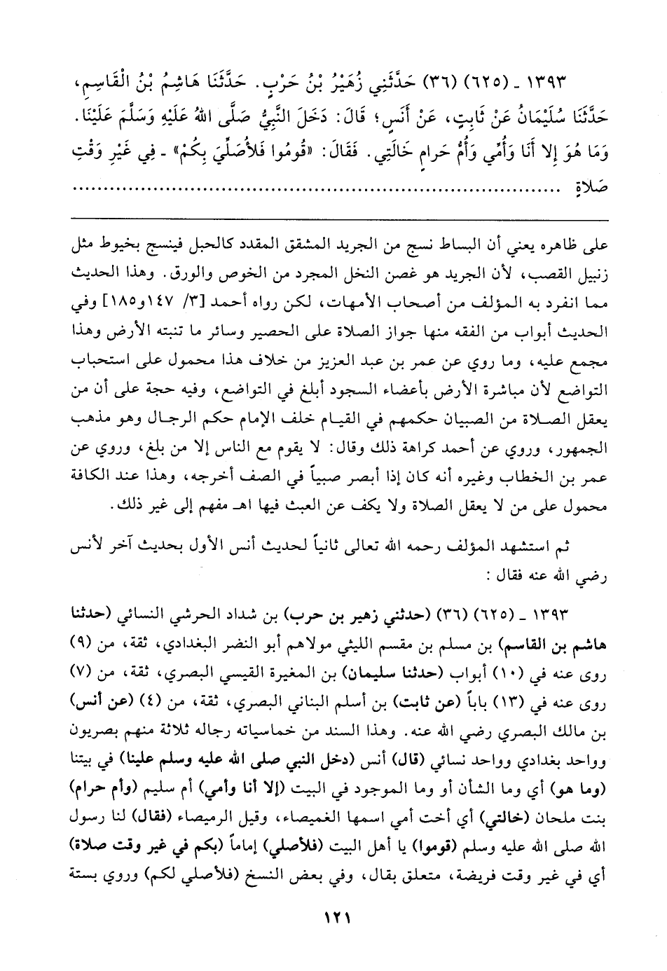 ١٣٩٣ - (٦٢٥) (٣٦) (حدثني زهير بن حرب) بن شداد الحرشي النسائي (حدثنا هاشم بن القاسم) بن مسلم بن مقسم الليثي مولاهم أبو النضر البغدادي، ثقة، من (٩) روى عنه في (١٠) أبواب (حدثنا سليمان) بن المغيرة القيسي البصري، ثقة، من (٧) روى عنه في (١٣) بابا (عن ثابت) بن أسلم البناني البصري، ثقة، من (٤) (عن أنس) بن مالك البصري رضي الله عنه. وهذا السند من خماسياته رجاله ثلاثة منهم بصريون وواحد بغدادي وواحد نسائي (قال) أنس (دخل النبي صلى الله عليه وسلم علينا) في بيتنا (وما هو) أي وما الشأن أو وما الموجود في البيت (إلا أنا وأمي) أم سليم (وأم حرام) بنت ملحان (خالتي) أي أخت أمي اسمها الغميصاء، وقيل الرميصاء (فقال) لنا رسول الله صلى الله عليه وسلم (قوموا) يا أهل البيت (فلأصلي) إمامًا (بكم في غير وقت صلاة) أي في غير وقت فريضة، متعلق يقال، وفي بعض النسخ (فلأصلي لكم) وروي بستة