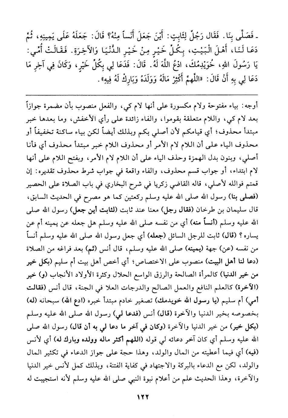 - فَصلَّى بِنَا. فَقَال رَجُلٌ لِثَابِتٍ: أَينَ جَعَلَ أَنسًا مِنْهُ؟ قَال: جَعَلَهُ عَلَى يَمِينِهِ، ثُمَّ دَعَا لَنَا، أَهْلَ الْبَيتِ، بِكُل خَيرٍ مِنْ خَيرِ الدُّنْيَا وَالآخِرَةِ. فَقَالتْ أُمِّي: يَا رَسُولَ اللهِ، خُوَيدِمُكَ، ادْعُ اللهَ لَهُ. قَال: فَدَعَا لِي بِكُلِّ خَيرٍ، وَكَانَ فِي آخِرِ مَا دَعَا لِي بِهِ أَنْ قَال: "اللَّهمَّ أَكْثِرْ مَالهُ وَوَلَدَهُ وَبَارِكْ لَهُ فِيهِ"