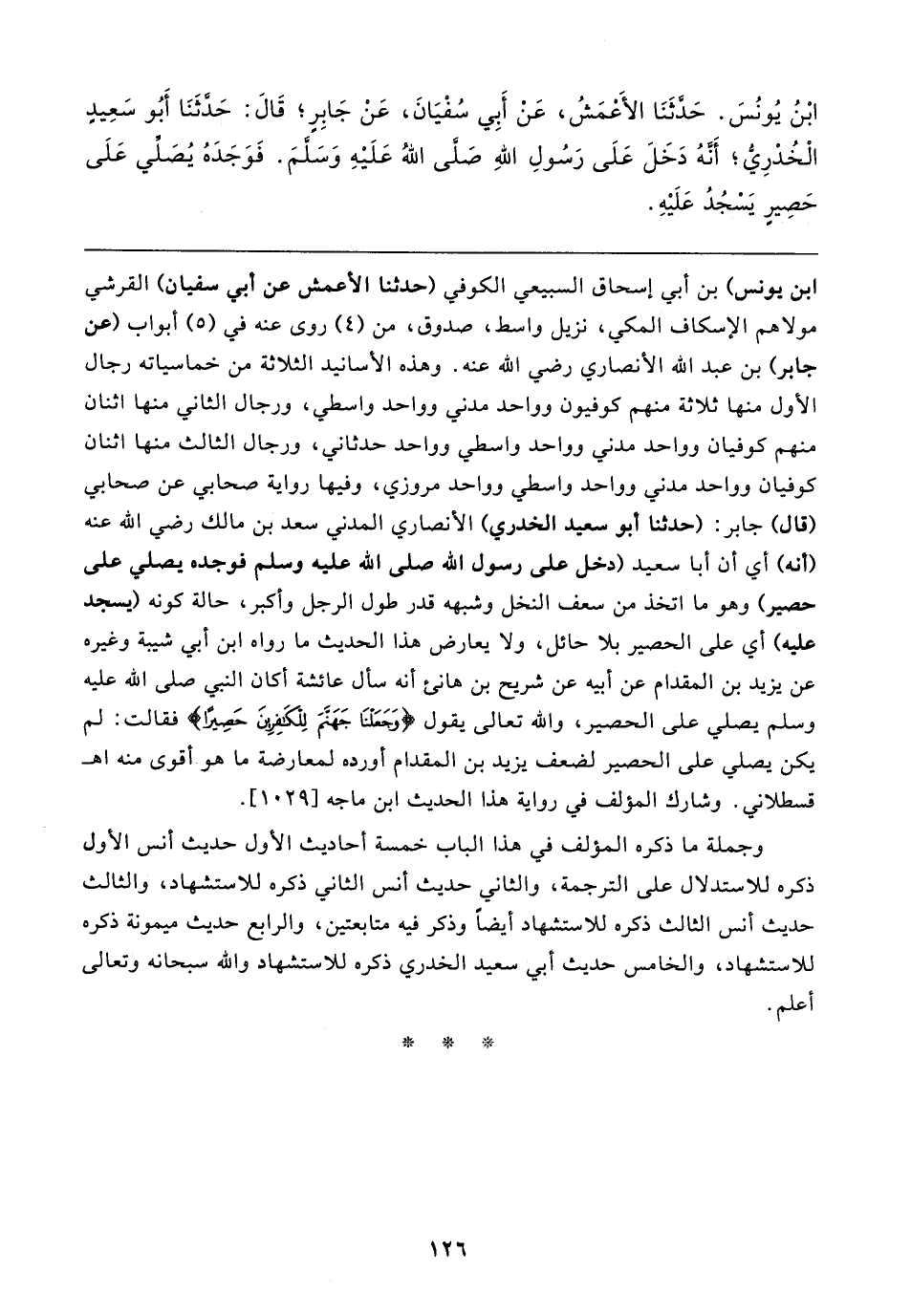 ابْنُ يُونُسَ. حَدَّثَنَا الأَعْمَشُ، عَنْ أبِي سُفْيَانَ، عَنْ جَابِرٍ؛ قَال: حَدَّثَنَا أبُو سَعِيدٍ الْخُدْرِيُّ؛ أَنَّهُ دَخَلَ عَلَى رَسُولِ اللهِ صَلَّى اللهُ عَلَيهِ وَسَلَّمَ. فَوَجَدَهُ يُصَلِّي عَلَى حَصِيرِ يَسْجُدُ عَلَيهِ