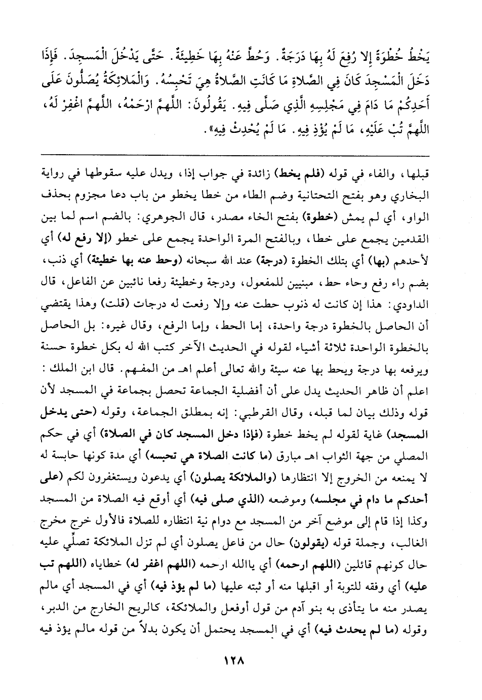 يَخْطُ خُطْوَةً إِلا رُفِعَ لَهُ بِهَا دَرَجَةٌ. وَحُطَّ عَنْهُ بِهَا خَطِيئَةٌ. حَتَّى يَدْخُلَ الْمَسجِدَ. فَإِذَا دَخَلَ الْمَسْجِدَ كَانَ فِي الصَّلاةِ مَا كَانَتِ الصَّلاةُ هِيَ تَحْبِسُهُ. وَالْمَلائِكَةُ يُصَلُّونَ عَلَى أَحَدِكُمْ مَا دَامَ فِي مَجْلِسِهِ الَّذِي صَلَّى فِيهِ. يَقُولُونَ: اللَّهمَّ ارْحَمْهُ، اللَّهمَّ اغْفِرْ لَهُ، اللَّهمَّ تُبْ عَلَيهِ، مَا لَمْ يُؤْذِ فِيهِ. مَا لَمْ يُحْدِثْ فِيهِ"