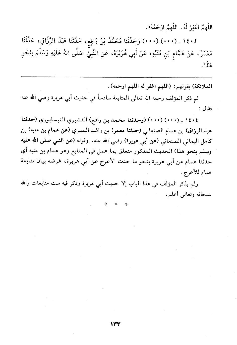١٤٠٤ - (٠٠) (٠٠) (وحدثنا محمد بن رافع) القشيري النيسابوري (حدثنا عبد الرزاق) بن همام الصنعاني (حدثنا معمر) بن راشد البصري (عن همام بن منبه) بن كامل اليماني الصنعاني (عن أبي هريرة) رضي الله عنه، وقوله (عن النبي صلى الله عليه وسلم بنحو هذا) الحديث المذكور متعلق بما عمل في المتابع وهو همام بن منبه أي حدثنا همام عن أبي هريرة بنحو ما حدث الأعرج عن أبي هريرة، غرضه بيان متابعة همام للأعرج.