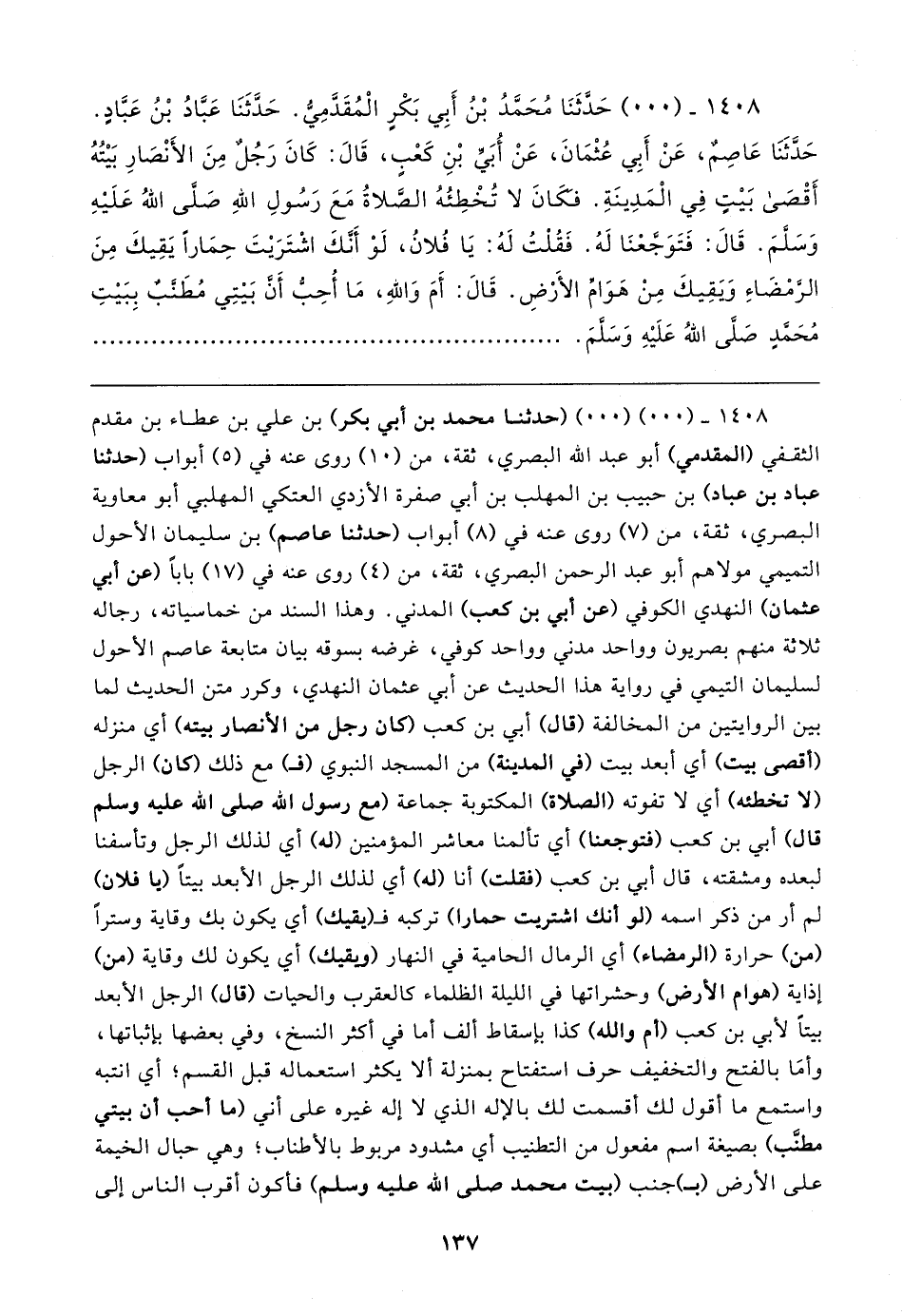 ١٤٠٨ - (٠٠) حَدَّثَنَا مُحَمَّدُ بْنُ أَبِي بَكْرٍ الْمُقَدَّمِيُّ. حَدَّثَنَا عَبَّادُ بْنُ عَبَّادٍ. حَدَّثَنَا عَاصِمٍ، عَنْ أَبِي عُثْمَانَ، عَنْ أُبَيِّ بْنِ كَعْبٍ، قَال: كَانَ رَجُل مِنَ الأَنْصَارِ بَيتُهُ أَقْصَى بَيتٍ فِي الْمَدِينَةِ. فكَانَ لا تُخْطِئُهُ الصَّلاةُ مَعَ رَسُولِ اللهِ صَلَّى اللهُ عَلَيهِ وَسَلَّمَ. قَال: فَتَوَجَّعْنَا لَهُ. فَقُلْتُ لَهُ: يَا فُلانُ، لَوْ أَنَّكَ اشْتَرَيتَ حِمَارًا يَقِيكَ مِنَ الرَّمْضَاءِ وَيَقِيكَ مِنْ هَوَامِّ الأَرْضِ. قَال: أَمَ وَاللهِ، مَا أُحِبُّ أَنَّ بَيتِي مُطَنَّبٌ بِبَيتِ مُحَمَّدٍ صَلَّى اللهُ عَلَيهِ وَسَلَّمَ