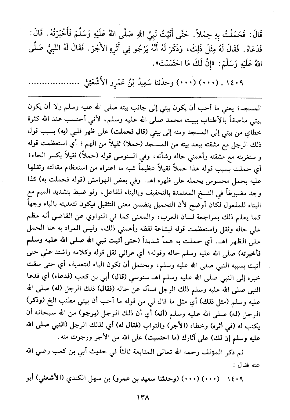 المسجد؛ يعني ما أحب أن يكون بيتي إلى جانب بيته صلى الله عليه وسلم ولا أن يكون بيتي ملصقًا بالأطناب ببيت محمد صلى الله عليه وسلم، لأني أحتسب عند الله كثرة خطاي من بيتي إلى المسجد ومنه إلى بيتي (قال فحملت) على ظهر قلبي (به) بسبب قول ذلك الرجل مع مشقته ببعد بيته من المسجد (حملًا) ثقيلًا من الهم؛ أي استعظمت قوله واستغربته مع مشقته وأهمني حاله وشأنه، وفي السنوسي قوله (حملًا) ثقيلًا بكسر الحاء؛ أي حملت بسبب قوله هذا حملًا ثقيلًا عظيمًا شبه ما اعتراه من استعظام مقالته وثقلها عليه بحمل محسوس يحمله على ظهره اهـ. وفي بعض الهوامش (قوله فحملت به) كذا وجد مضبوطًا في النسخ المعتمدة بالتخفيف وبالبناء للفاعل، ولو ضبط بتشديد الميم مع البناء للمفعول لكان أوضح لأن التحميل يتضمن معنى التثقيل فيكون لتعديته بالباء وجهًا كما يعلم ذلك بمراجعة لسان العرب، والمعنى كما في النواوي عن القاضي أنه عظم علي حاله وثقل واستعظمت قوله لبشاعة لفظه وأهمني ذلك، وليس المراد به هنا الحمل على الظهر اهـ. أي حملت به همًا شديدًا (حتى أتيت نبي الله صلى الله عليه وسلم فأخبرته) صلى الله عليه وسلم حاله وقوله؛ أي عراني ثقل قوله وكلامه واشتد علي حتى أتيت بسببه النبي صلى الله عليه وسلم، ويحتمل أن تكون الباء للتعدية، أي حتى سقت خبره إلى النبي صلى الله عليه وسلم اهـ سنوسي (قال) أبي بن كعب (فدعاه) أي فدعا النبي صلى الله عليه وسلم ذلك الرجل فسأله عن حاله (فقال) ذلك الرجل (له) صلى الله عليه وسلم (مثل ذلك) أي مثل ما قال لي من قوله ما أحب أن بيتي مطنب الخ (وذكر) الرجل (له) صلى الله عليه وسلم (أنه) أي أن ذلك الرجل (يرجو) من الله سبحانه أن يكتب له (في أثره) وخطاه (الأجر) والثواب (فقال له) أي لذلك الرجل (النبي صلى الله عليه وسلم أن لك) على آثارك (ما احتسبت) على الله من الأجر ورجوت منه.