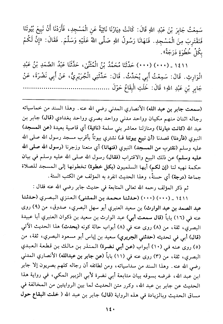 ١٤١١ - (٠٠) (٠٠) (حدثنا محمد بن المثنى) العنزي البصري (حدثنا عبد الصمد بن عبد الوارث) بن سعيد العنبري أبو سهل البصري، صدوق، من (٩) روى عنه في (١٦) بابا (قال سمعت أبي) عبد الوارث بن سعيد بن ذكوان العنبري أبا عبيدة البصري، ثقة، من (٨) روى عنه في (٨) أبواب حالة كونه (يحدث) هذا الحديث الآتي (قال) أبي في تحديثه (حدثني الجريري) سعيد بن إياس أبو مسعود البصري، ثقة، من (٥) روى عنه في (١٠) أبواب (عن أبي نضرة) المنذر بن مالك بن قطعة العبدي البصري، ثقة، من (٣) روى عنه في (١١) بابا (عن جابر بن عبد الله) الأنصاري المدني رضي الله عنه. وهذا السند من سداسياته، ومن لطائفه أن رجاله كلهم بصريون إلا جابر ابن عبد الله، غرضه بسوقه بيان متابعة أبي نضرة لأبي الزبير المكي، في رواية هذا الحديث عن جابر بن عبد الله، وكرر متن الحديث لما بين الروايتين من المخالفة في مساق الحديث وبالزيادة في هذه الرواية (قال) جابر بن عبد الله (خلت البقاع حول