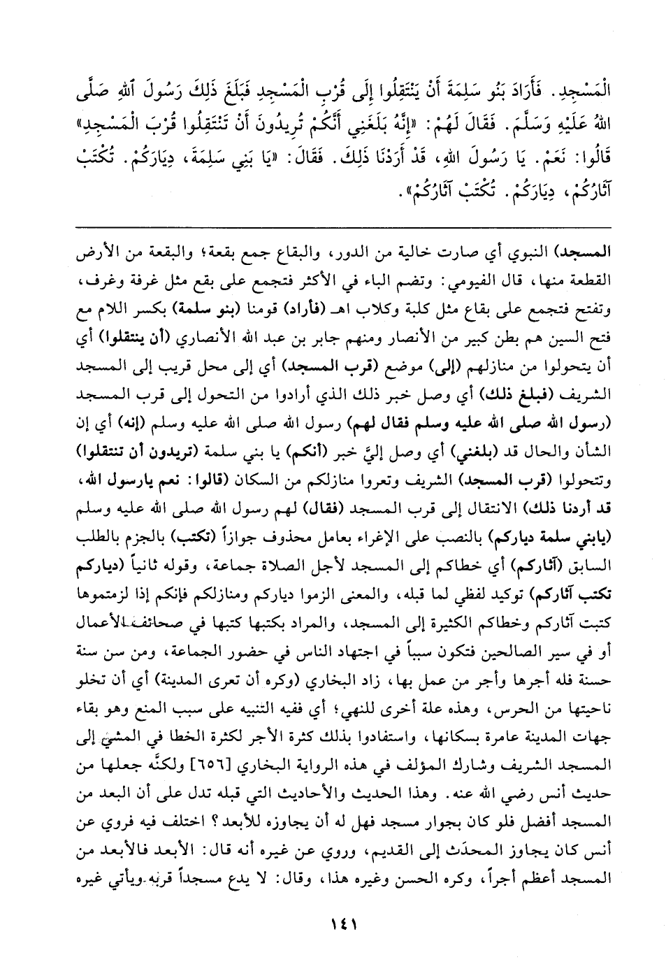 الْمَسْجِدِ. فَأَرَادَ بَنُو سَلِمَةَ أَنْ يَنْتَقِلُوا إِلَى قُرْبِ الْمَسْجِدِ فَبَلَغَ ذَلِكَ رَسُولَ اللهِ صَلَّى اللهُ عَلَيهِ وَسَلَّمَ. فَقَال لَهُمْ: "إِنَّهُ بَلَغَنِي أَنَّكُمْ تُرِيدُونَ أَنْ تَنْتَقِلُوا قُرْبَ الْمَسْجِدِ" قَالُوا: نَعَمْ. يَا رَسُولَ اللهِ، قَدْ أَرَدْنَا ذَلِكَ. فَقَال: "يَا بَنِي سَلِمَةَ، دِيَارَكُمْ. تُكْتَبْ آثَارُكُمْ، دِيَارَكُمْ. تُكْتَبْ آثَارُكُمْ"