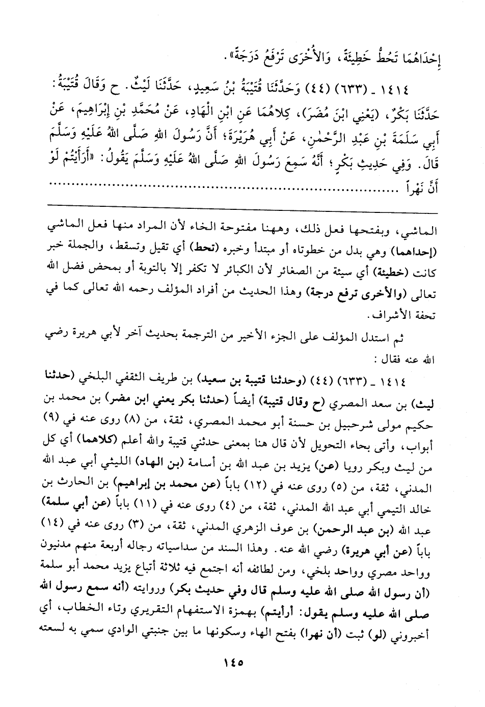 ١٤١٤ - (٦٣٣) (٤٤) وَحَدَّثَنَا قُتَيبَةُ بْنُ سَعِيدٍ، حَدَّثَنَا لَيثٌ. خ وَقَال قُتَيبَةُ: حَدَّثَنَا بَكْرٌ، (يَعْنِي ابْنَ مُضَرَ)، كِلاهُمَا عَنِ ابْنِ الْهَادِ، عَنْ مُحَمَّدِ بْنِ إِبْرَاهِيمَ، عَنْ أَبِي سَلَمَةَ بْنِ عَبْدِ الرَّحْمنِ، عَنْ أَبِي هُرَيرَةَ؛ أَن رَسُولَ اللهِ صَلَّى اللهُ عَلَيهِ وَسَلَّمَ قَال. وَفِي حَدِيثِ بَكْرٍ؛ أَنَّهُ سَمِعَ رَسُولَ اللهِ صَلَّى اللهُ عَلَيهِ وَسَلَّمَ يَقُولُ: "أَرَأَيتُمْ لَوْ أَن نَهْرًا