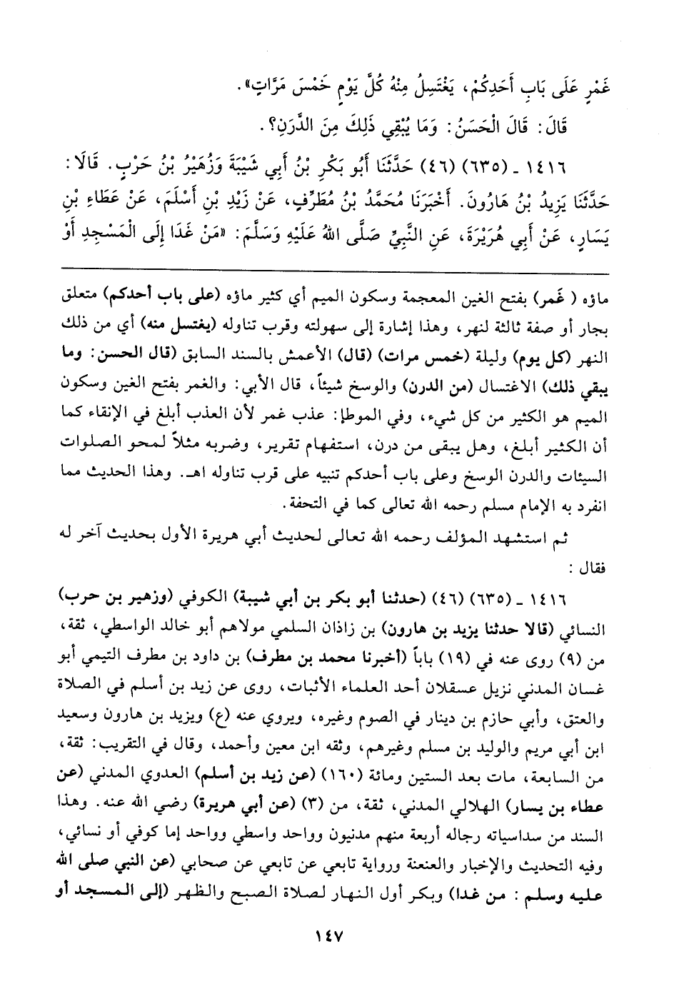 ١٤١٦ - (٦٣٥) (٤٦) حَدَّثَنَا أَبُو بَكْرِ بْنُ أَبِي شَيبَةَ وَزُهَيرُ بْنُ حَرْبٍ. قَالا: حَدَّثَنَا يَزِيدُ بْنُ هَارُونَ. أَخْبَرَنَا مُحَمَّدُ بْنُ مُطَرِّفٍ، عَنْ زيدِ بْنِ أَسْلَمَ، عَنْ عَطَاءِ بْنِ يَسَارٍ، عَنْ أَبِي هُرَيرَةَ، عَنِ النَّبِيِّ صَلَّى اللهُ عَلَيهِ وَسَلَّمَ: "مَنْ غَدَا إِلَى الْمَسْجِدِ أَوْ