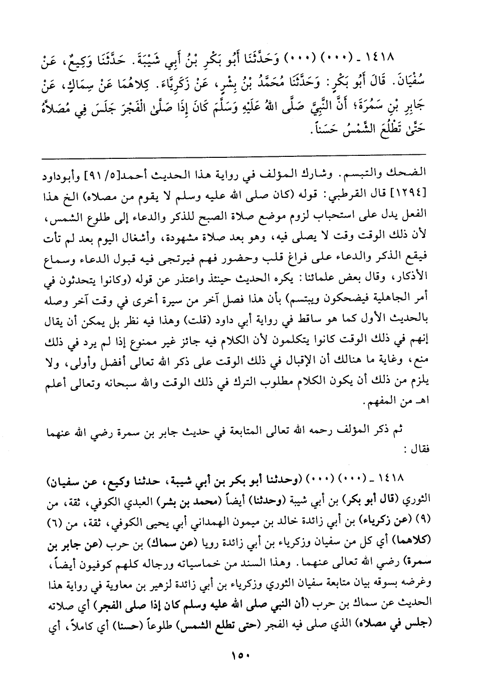 ١٤١٨ - (٠٠) (٠٠) وَحَدَّثَنَا أبُو بَكْرِ بْنُ أَبِي شَيبَةَ. حَدَّثَنَا وَكِيعٌ، عَنْ سُفْيَانَ. قَال أَبُو بَكْرٍ: وَحَدَّثنَا مُحَمَّدُ بْنُ بِشْرٍ، عَنْ زَكَرِيَّاءَ. كِلاهُمَا عَنْ سِمَاكٍ، عَنْ جَابِرِ بْنِ سَمُرَةَ؛ أَنَّ النَّبِيَّ صَلَّى اللهُ عَلَيهِ وَسَلَّمَ كَانَ إِذَا صَلَّى الْفَجْرَ جَلَسَ فِي مُصَلَّاهُ حَتَّى تَطْلُعَ الشَّمْسُ حَسَنًا