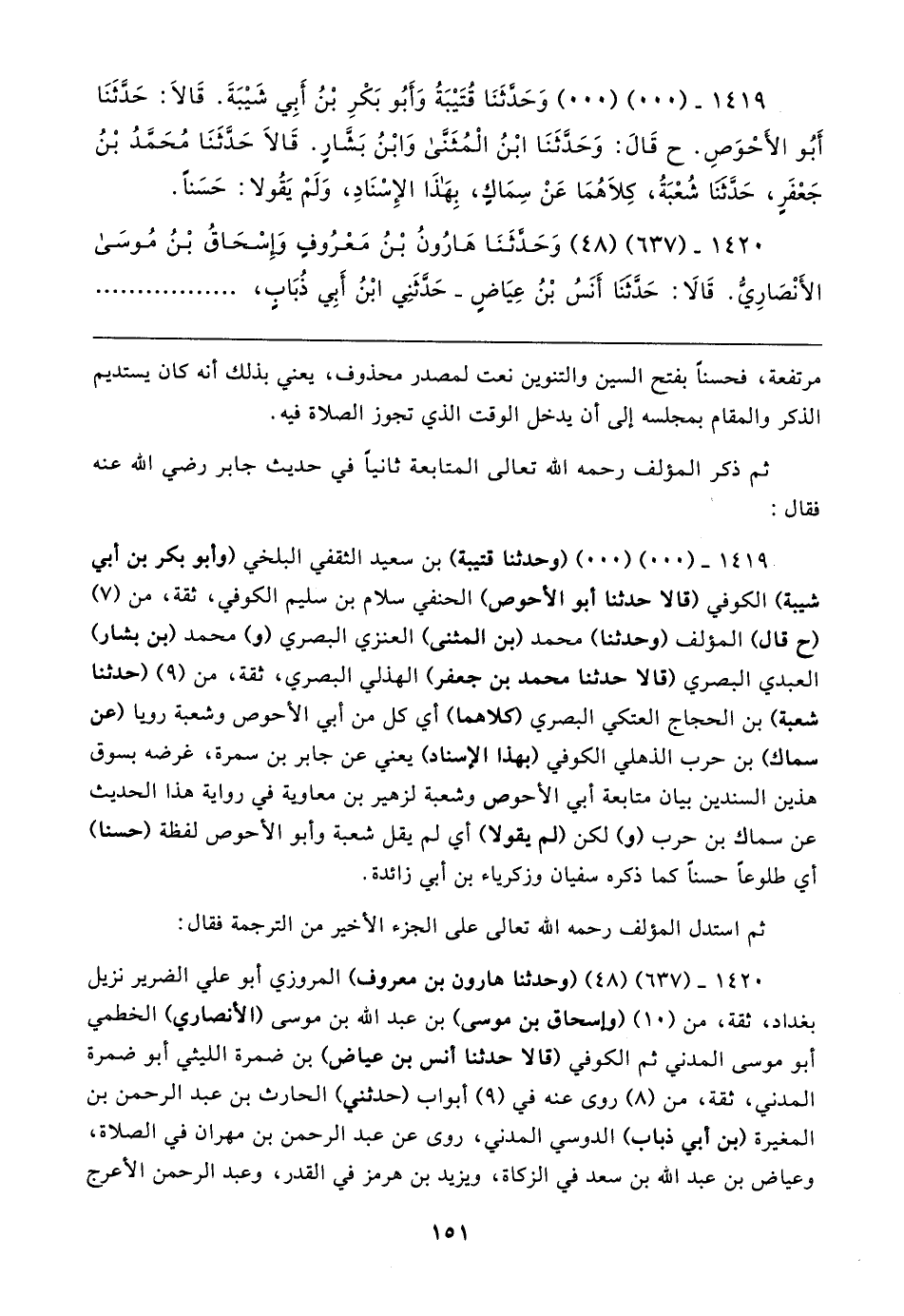 ١٤١٩ - (٠٠) (٠٠) (وحدثنا قتيبة) بن سعيد الثقفي البلخي (وأبو بكر بن أبي شيبة) الكوفي (قالا حدثنا أبو الأحوص) الحنفي سلام بن سليم الكوفي، ثقة، من (٧) (ح قال) المؤلف (وحدثنا) محمد (بن المثنى) العنزي البصري (و) محمد (بن بشار) العبدي البصري (قالا حدثنا محمد بن جعفر) الهذلي البصري، ثقة، من (٩) (حدثنا شعبة) بن الحجاج العتكي البصري (كلاهما) أي كل من أبي الأحوص وشعبة رويا (عن سماك) بن حرب الذهلي الكوفي (بهذا الإسناد) يعني عن جابر بن سمرة، غرضه بسوق هذين السندين بيان متابعة أبي الأحوص وشعبة لزهير بن معاوية في رواية هذا الحديث عن سماك بن حرب (و) لكن (لم يقولا) أي لم يقل شعبة وأبو الأحوص لفظة (حسنا) أي طلوعًا حسنًا كما ذكره سفيان وزكرياء بن أبي زائدة.