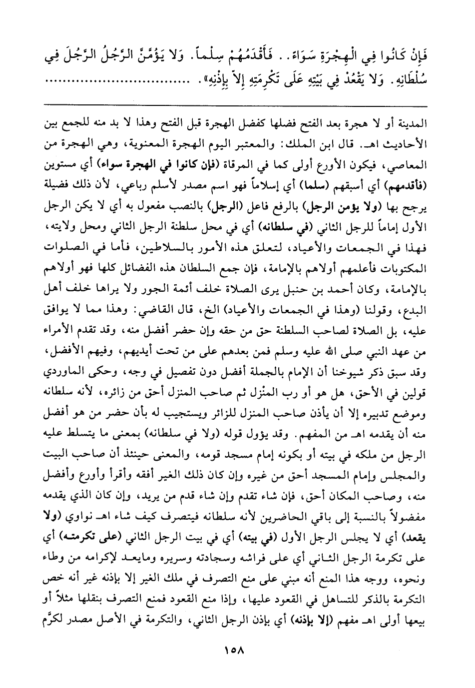فَإِنْ كَانُوا فِي الْهِجْرَةِ سَوَاءً. . فَأَقْدَمُهُمْ سِلْمًا. وَلا يَؤُمِّنَّ الرَّجُلُ الرَّجُلَ فِي سُلْطَانِهِ. وَلا يَقْعُدْ فِي بَيتِهِ عَلَى تَكْرِمَتِهِ إلا بِإِذْنِهِ"