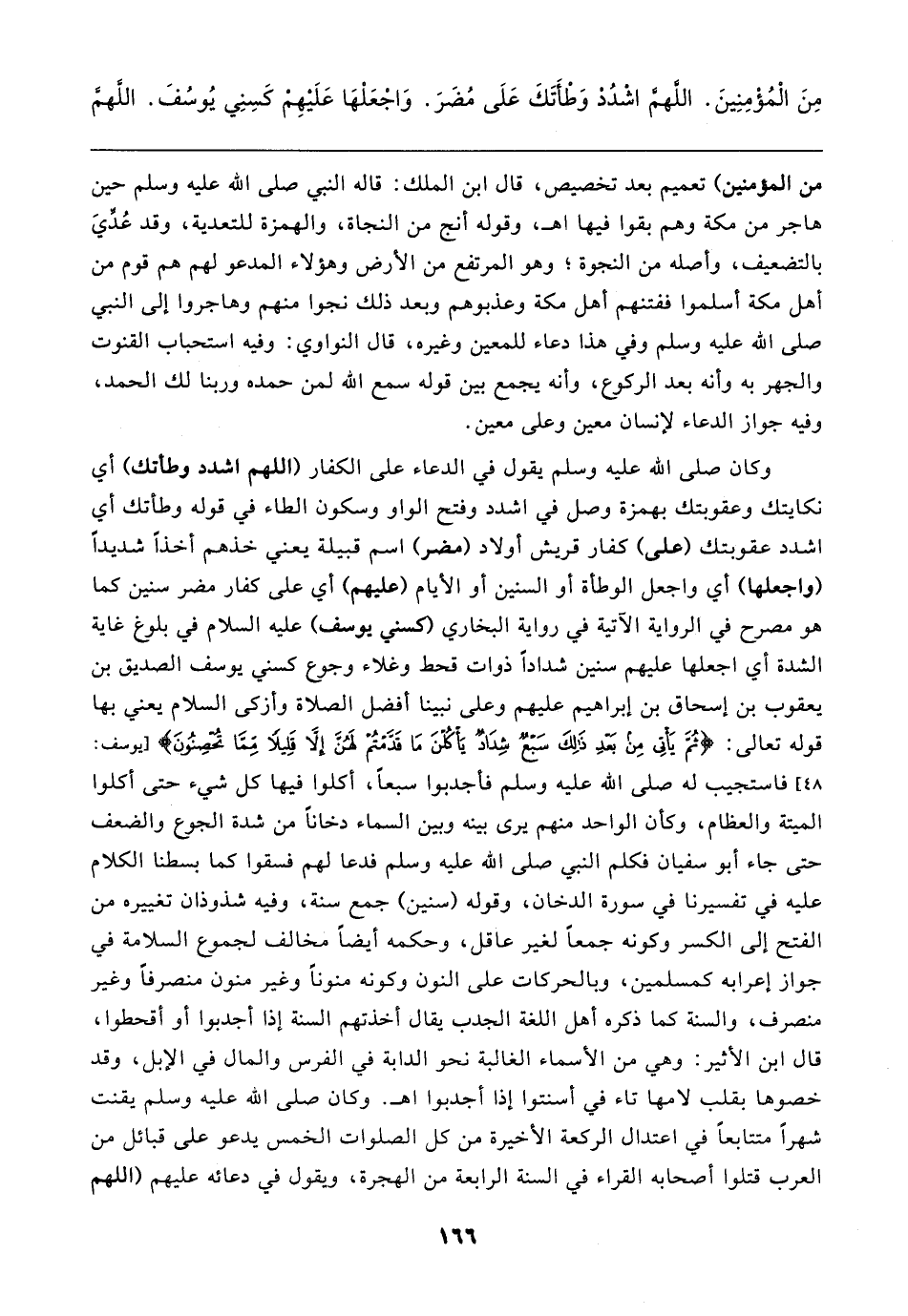 وكان - صلى الله عليه وسلم - يقول في الدعاء على الكفار (اللهم اشدد وطأتك) أي نكايتك وعقوبتك بهمزة وصل في اشدد وفتح الواو وسكون الطاء في قوله وطأتك أي اشدد عقوبتك (على) كفار قريش أولاد (مضر) اسم قبيلة يعني خذهم أخذًا شديدًا (واجعلها) أي واجعل الوطأة أو السنين أو الأيام (عليهم) أي على كفار مضر سنين كما هو مصرح في الرواية الآتية في رواية البخاري (كسني يوسف) - عليه السلام - في بلوغ غاية الشدة أي اجعلها عليهم سنين شدادًا ذوات قحط وغلاء وجوع كسني يوسف الصديق بن يعقوب بن إسحاق بن إبراهيم عليهم وعلى نبينا أفضل الصلاة وأزكى السلام يعني بها قوله تعالى: {ثُمَّ يَأْتِي مِنْ بَعْدِ ذَلِكَ سَبْعٌ شِدَادٌ يَأْكُلْنَ مَا قَدَّمْتُمْ لَهُنَّ إلا قَلِيلًا مِمَّا تُحْصِنُونَ} [يوسف: ٤٨] فاستجيب له - صلى الله عليه وسلم - فأجدبوا سبعًا، أكلوا فيها كل شيء حتى أكلوا الميتة والعظام، وكأن الواحد منهم يرى بينه وبين السماء دخانًا من شدة الجوع والضعف حتى جاء أبو سفيان فكلم النبي - صلى الله عليه وسلم - فدعا لهم فسقوا كما بسطنا الكلام عليه في تفسيرنا في سورة الدخان، وقوله (سنين) جمع سنة، وفيه شذوذان تغييره من الفتح إلى الكسر وكونه جمعًا لغير عاقل، وحكمه أيضًا مخالف لجموع السلامة في جواز إعرابه كمسلمين، وبالحركات على النون وكونه منونًا وغير منون منصرفًا وغير منصرف، والسنة كما ذكره أهل اللغة الجدب يقال أخذتهم السنة إذا أجدبوا أو أقحطوا، قال ابن الأثير: وهي من الأسماء الغالبة نحو الدابة في الفرس والمال في الإبل، وقد خصوها بقلب لامها تاء في أسنتوا إذا أجدبوا اهـ. وكان - صلى الله عليه وسلم - يقنت شهرًا متتابعًا في اعتدال الركعة الأخيرة من كل الصلوات الخمس يدعو على قبائل من العرب قتلوا أصحابه القراء في السنة الرابعة من الهجرة، ويقول في دعائه عليهم (اللهم