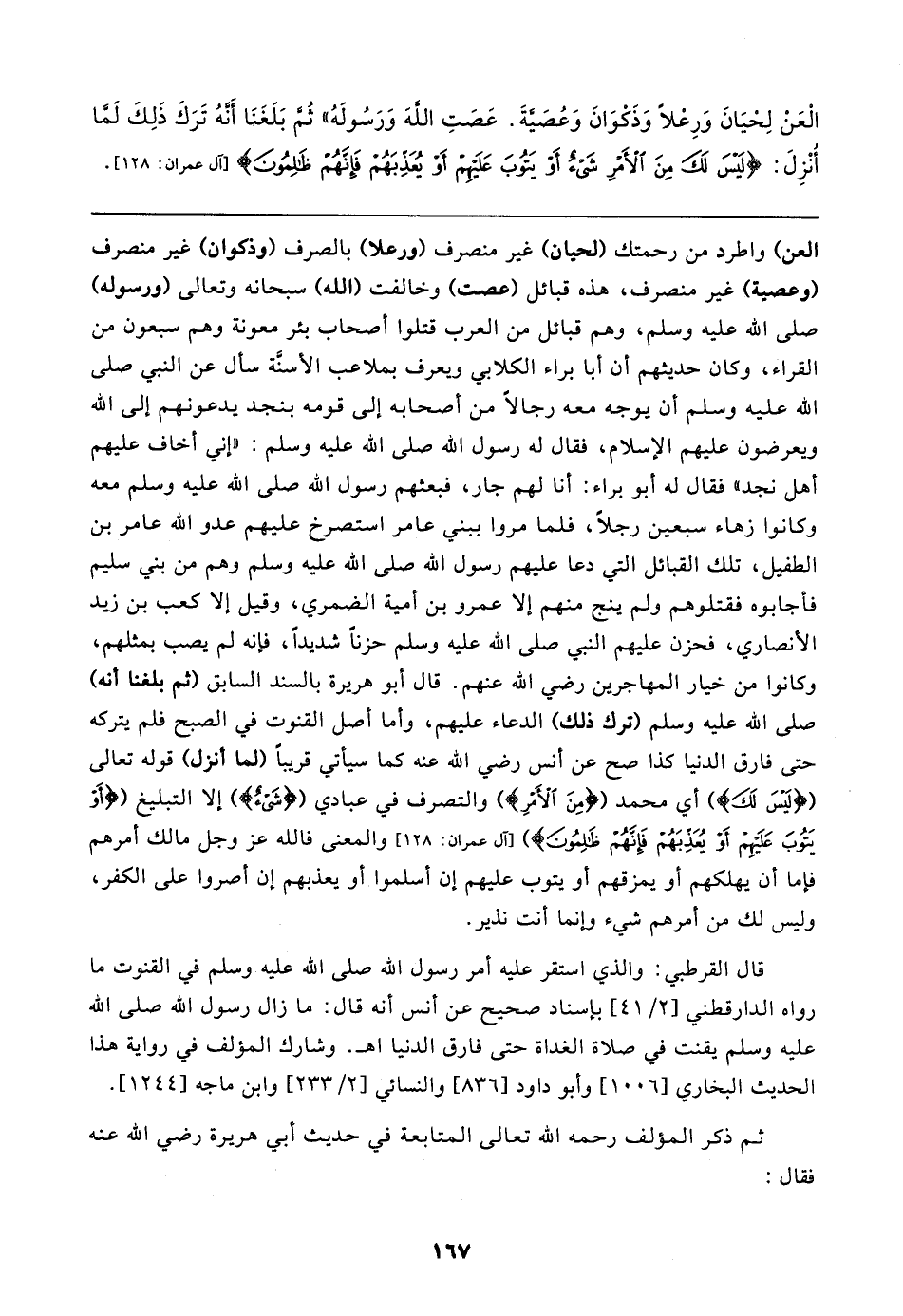 الْعَنْ لِحْيَانَ وَرِعْلًا وَذَكْوَانَ وَعُصَيَّةَ. عَصَتِ اللهَ وَرَسُولَهُ" ثُمَّ بَلَغَنَا أَنَّهُ تَرَكَ ذَلِكَ لَمَّا أُنْزِلَ: {لَيسَ لَكَ مِنَ الْأَمْرِ شَيءٌ أَوْ يَتُوبَ عَلَيهِمْ أَوْ يُعَذِّبَهُمْ فَإِنَّهُمْ ظَالِمُونَ} [آل عمران: ١٢٨]