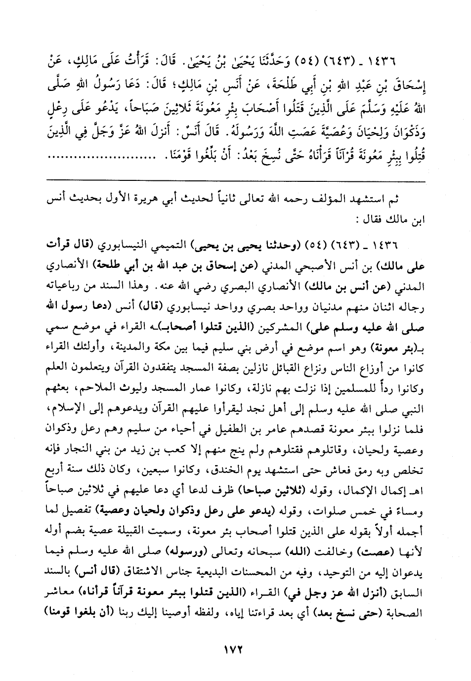 ١٤٣٦ - (٦٤٣) (٥٤) (وحدثنا يحيى بن يحيى) التميمي النيسابوري (قال قرأت على مالك) بن أنس الأصبحي المدني (عن إسحاق بن عبد الله بن أبي طلحة) الأنصاري المدني (عن أنس بن مالك) الأنصاري البصري - رضي الله عنه -. وهذا السند من رباعياته رجاله اثنان منهم مدنيان وواحد بصري وواحد نيسابوري (قال) أنس (دعا رسول الله - صلى الله عليه وسلم - على) المشركين (الذين قتلوا أصحابـ) ـه القراء في موضع سمي بـ (بئر معونة) وهو اسم موضع في أرض بني سليم فيما بين مكة والمدينة، وأولئك القراء كانوا من أوزاع الناس ونزاع القبائل نازلين بصفة المسجد يتفقدون القرآن ويتعلمون العلم وكانوا ردأً للمسلمين إذا نزلت بهم نازلة، وكانوا عمار المسجد وليوث الملاحم، بعثهم النبي - صلى الله عليه وسلم - إلى أهل نجد ليقرأوا عليهم القرآن ويدعوهم إلى الإِسلام، فلما نزلوا ببئر معونة قصدهم عامر بن الطفيل في أحياء من سليم وهم رعل وذكوان وعصية ولحيان، وقاتلوهم فقتلوهم ولم ينج منهم إلا كعب بن زيد من بني النجار فإنَّه تخلص وبه رمق فعاش حتى استشهد يوم الخندق، وكانوا سبعين، وكان ذلك سنة أربع اهـ إكمال الإكمال، وقوله (ثلاثين صباحا) ظرف لدعا أي دعا عليهم في ثلاثين صباحًا ومساءً في خمس صلوات، وقوله (يدعو على رعل وذكوان ولحيان وعصية) تفصيل لما أجمله أولًا بقوله على الذين قتلوا أصحاب بئر معونة، وسميت القبيلة عصية بضم أوله لأنها (عصت) وخالفت (الله) سبحانه وتعالى (ورسوله) - صلى الله عليه وسلم - فيما يدعوان إليه من التوحيد، وفيه من المحسنات البديعية جناس الاشتقاق (قال أنس) بالسند السابق (أنزل الله عَزَّ وَجَلَّ في) القراء (الذين قتلوا ببئر معونة قرآنًا قرأناه) معاشر الصحابة (حتى نسخ بعد) أي بعد قراءتنا إياه، ولفظه أوصينا إليك ربنا (أن بلغوا قومنا)